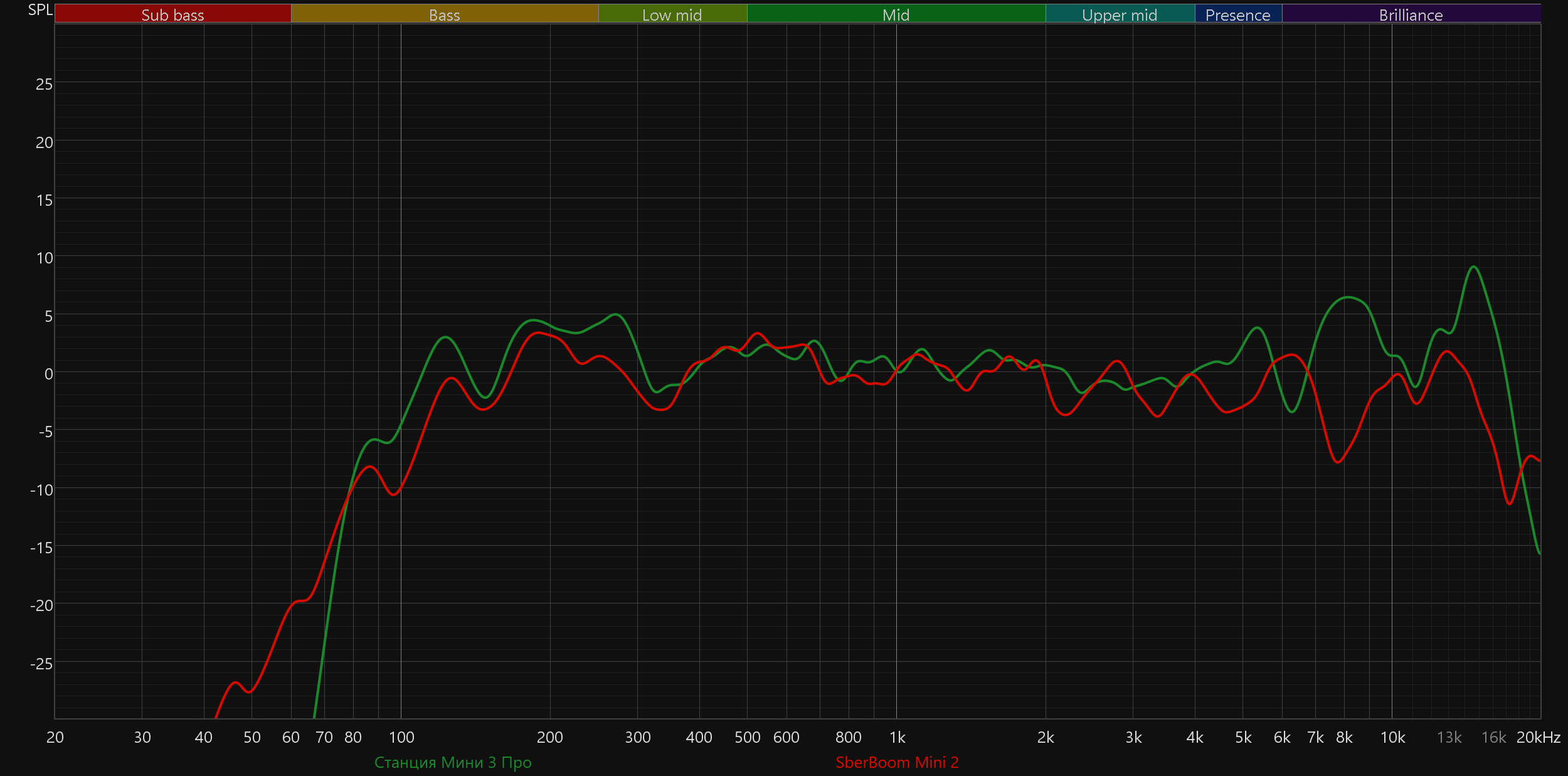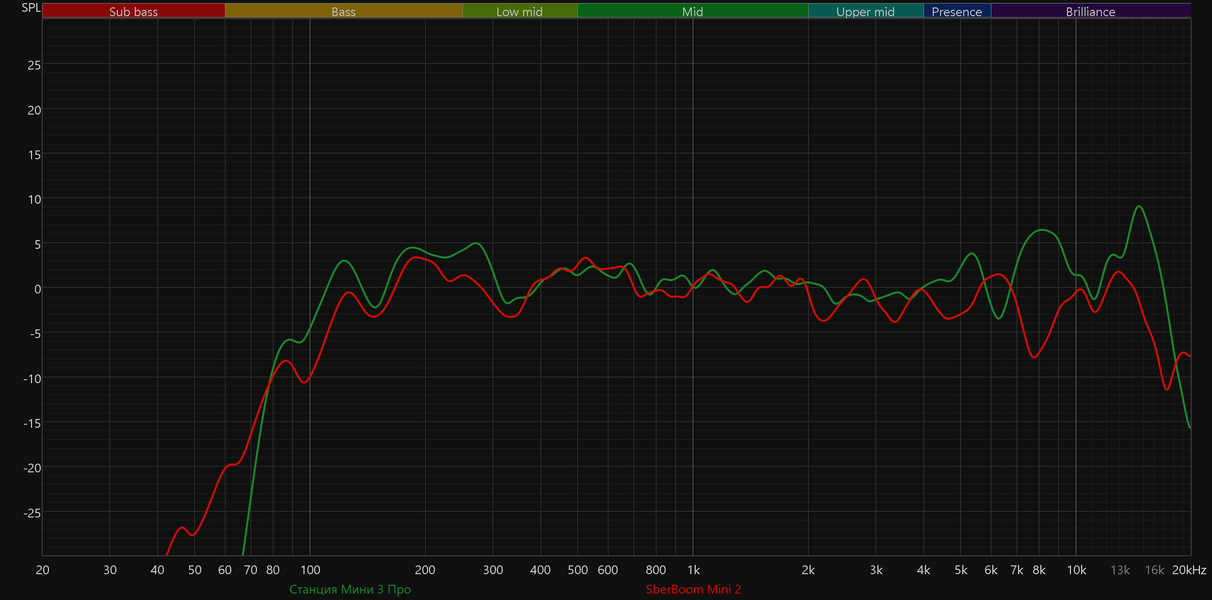 С вышедшей в прошлом году SberBoom Mini 2 звучание очень похоже, у последней есть небольшое преимущество за счет более сдержанного высокочастотного диапазона, но это скорее вопрос вкуса. А вот первую версию SberBoom Mini «Яндекс Станция Мини 3 Про» обходит уверенно.