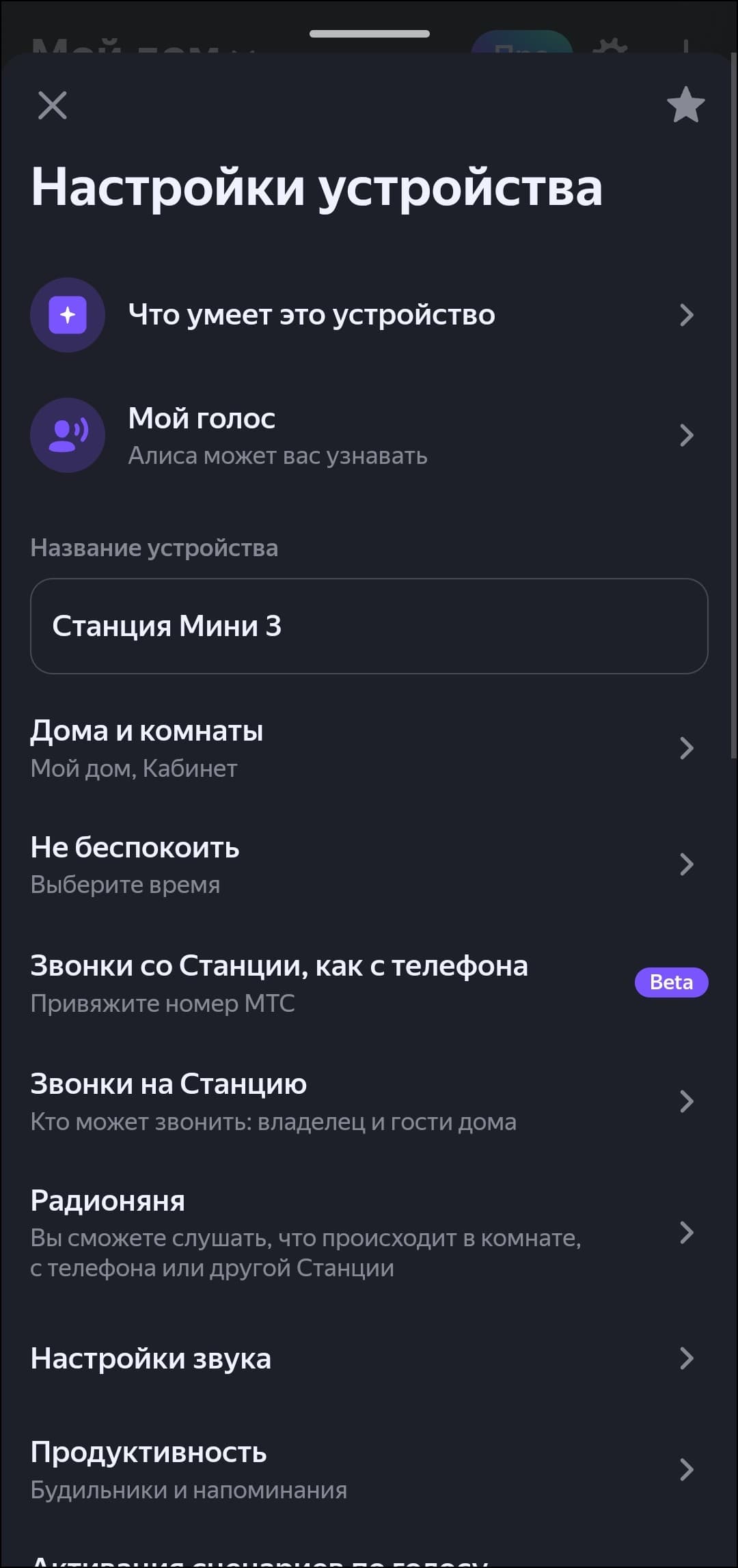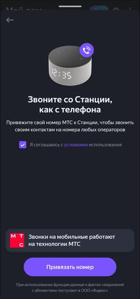 Сразу после подключения «Станция Мини» становится полноправным участником умного дома и позволяет управлять всеми ранее настроенными устройствами через голосового ассистента. Интересное нововведение — звонки на мобильные телефоны с помощью привязанного номера МТС. Пока функция находится в стадии бета-версии, но в целом уже можно попробовать воспользоваться — номер привязывается. Потенциально может быть довольно удобно, но более подробный разговор об этой возможности отложим до момента ее окончательного выхода.