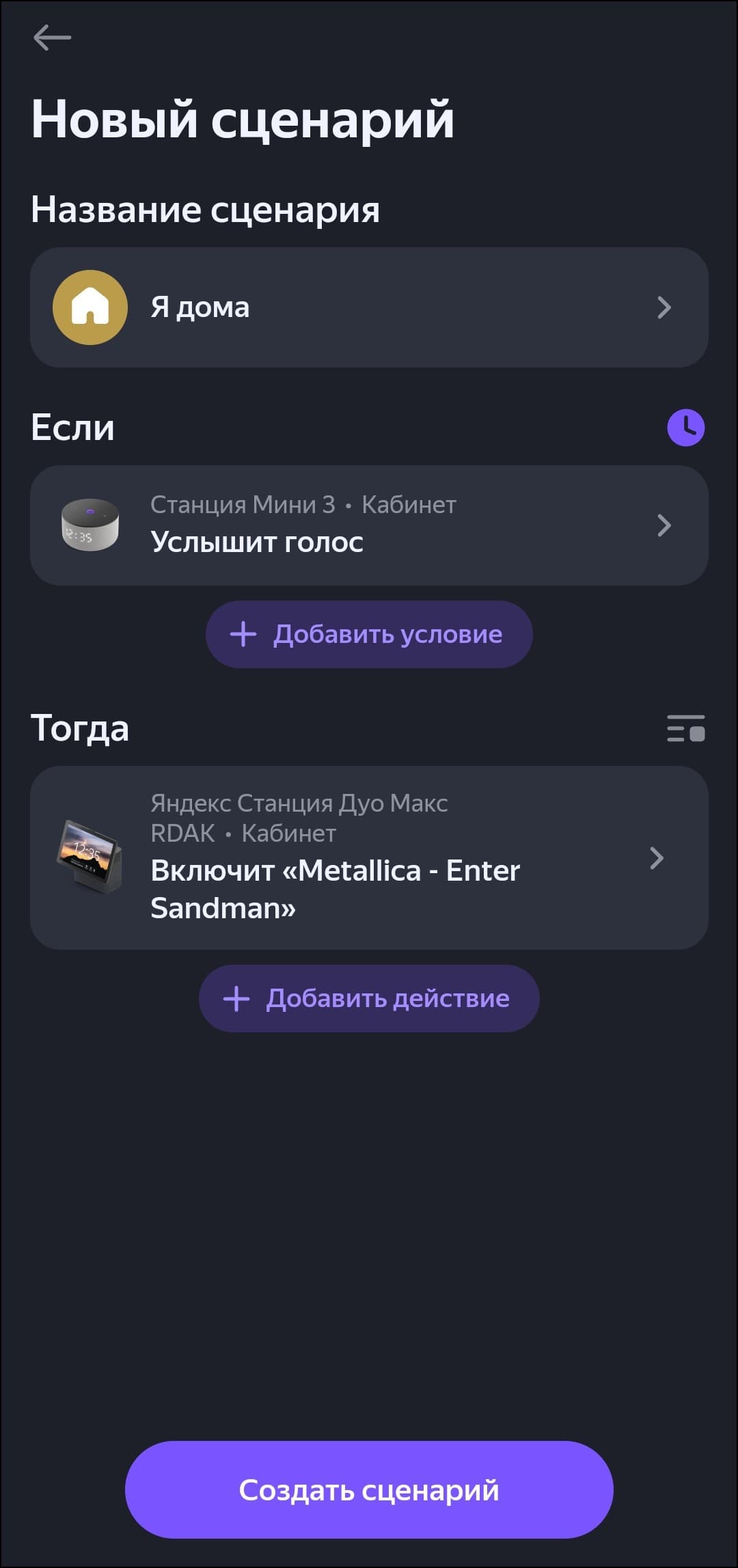 Среди интересных нововведений в системе умного дома можно отметить возможность активации сценариев голосом — колонка может совершать заданный пользователем список действий, услышав любой разговор. Можно использовать эту возможность для запуска утреннего шоу или любимого плейлиста для начала дня, либо чтобы немножко пощекотать нервы непрошеным гостям, например. Мы ради проверки как раз настроили воспроизведение композиции Metallica «Enter Sandman» — всё корректно срабатывает. Ну и еще одна маленькая новость: Алиса освоила казахский язык.