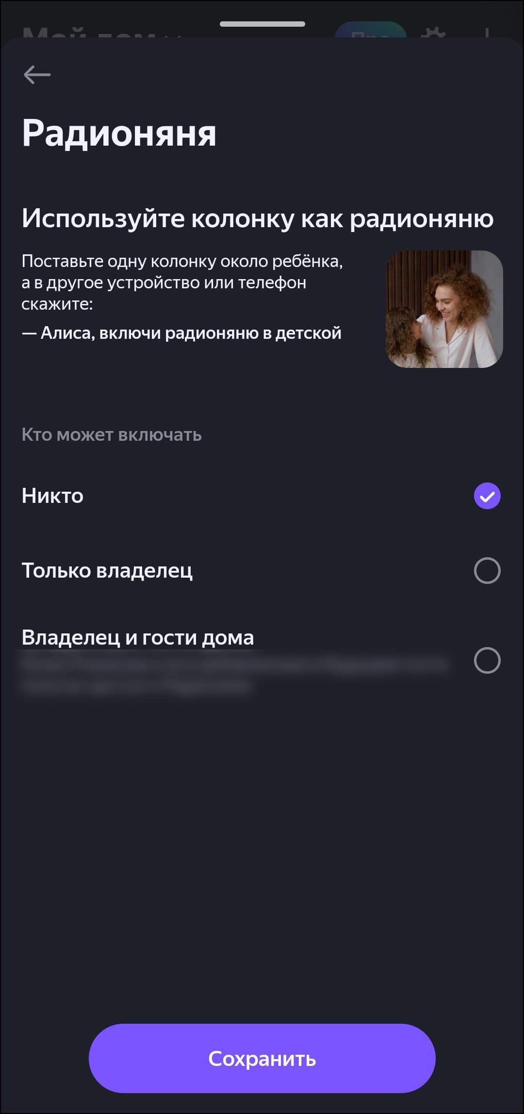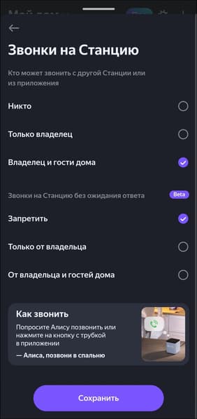 Как и на прочие смарт-колонки «Яндекса», на «Станцию Мини 3» можно позвонить с другой станции, либо с установленного на какой-нибудь мобильный гаджет приложения. Вести долгие разговоры в таком режиме не очень удобно, а вот возможность позвать кого-нибудь из соседней комнаты без криков на весь дом иногда очень пригождается. Сохранился и режим радионяни, что для колонки, которая имеет все шансы оказаться именно в детской комнате, очень важно. Хотя для детской теперь есть отдельное устройство — «Яндекс Станция Лайт 2», но тем не менее. Доступ к звонкам и функции радионяни настраивается — его можно дать как только владельцу устройства, так и гостям дома, список которых редактируется из приложения.