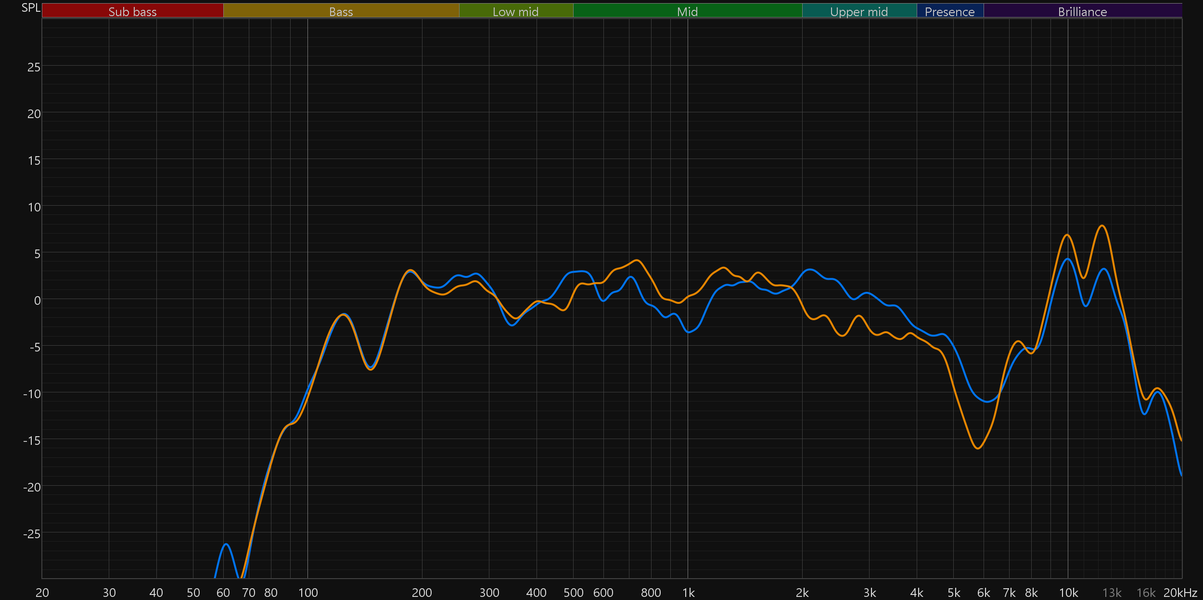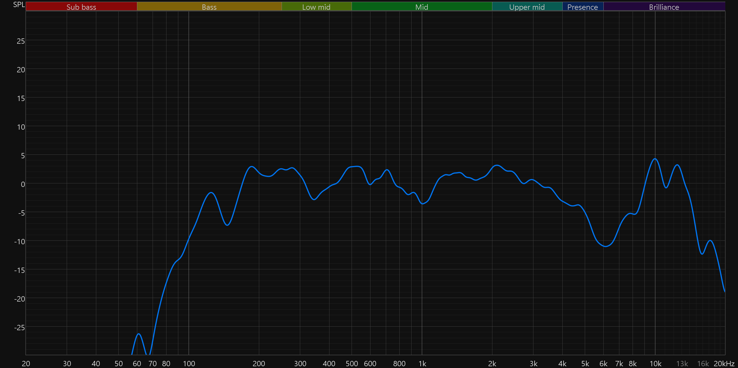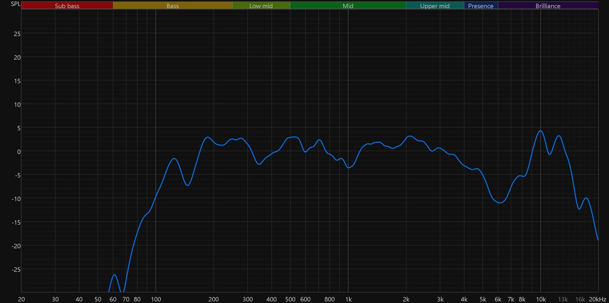 Далее графики усредняются, давая нам общую картину. Сразу отметим, что обещанный производителем бас от 110 Гц колонка действительно выдала, что замечательно. Но в целом особых причин для восторгов не наблюдается. Характер звучания по большей части определяется провалом в районе 6 кГц, который негативно сказывается сразу на многом: от звучания перкуссий и малого барабана до разборчивости вокала. Звучание получается очень «серединистое», что неплохо для «общения» с голосовым ассистентом, но в остальных случаях расстраивает.