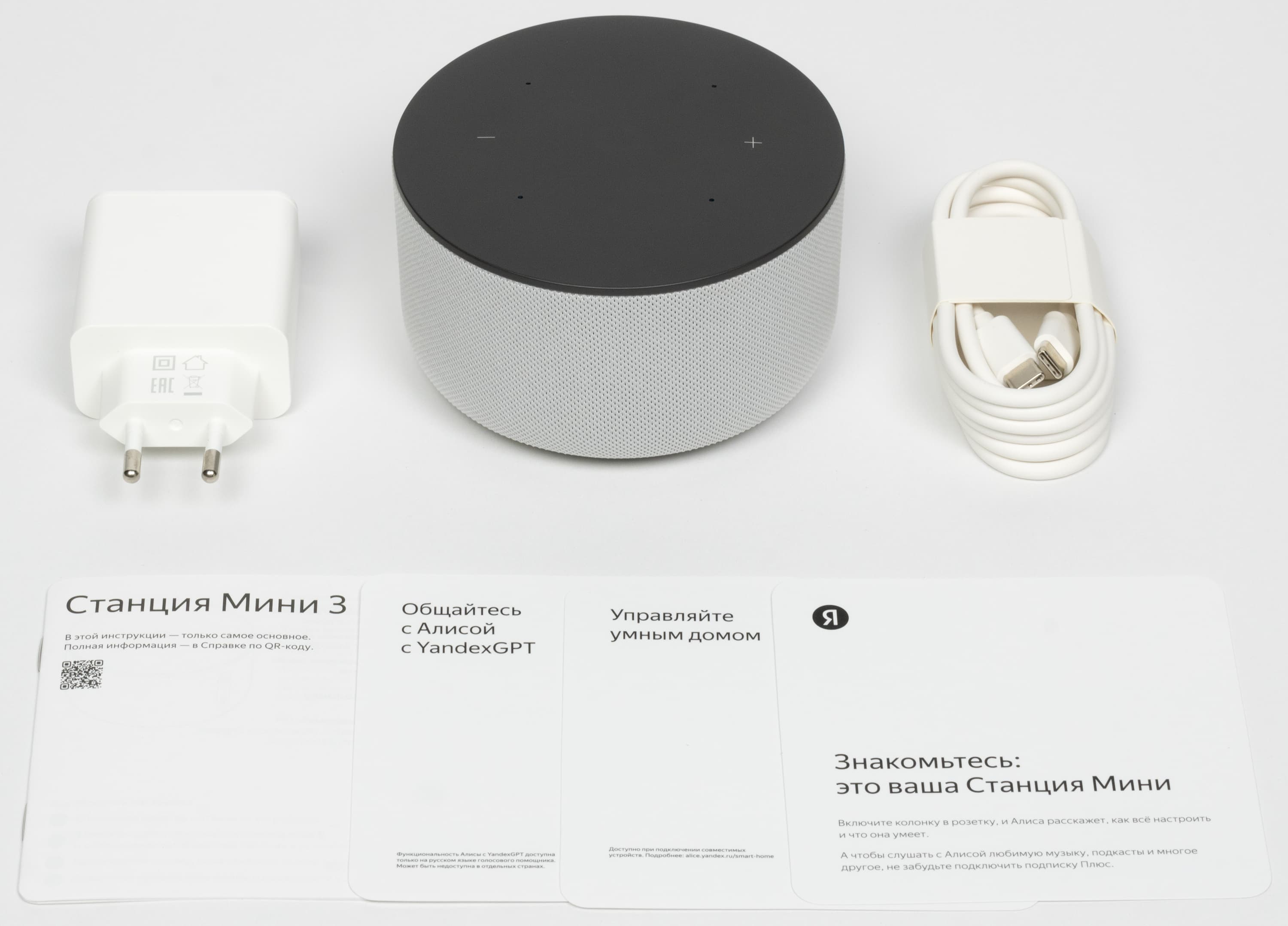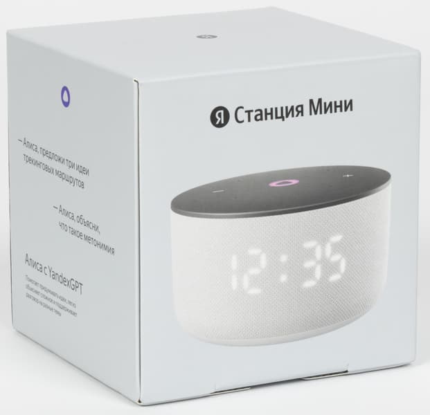 Упакована «Станция Мини 3» в характерную для небольших колонок «Яндекса» картонную коробку, на которую нанесены изображение и название устройства, его краткие характеристики, а также примеры команд голосовому ассистенту Алисе. Внутри колонка и аксессуары к ней надежно удерживаются с помощью картонного ложемента.