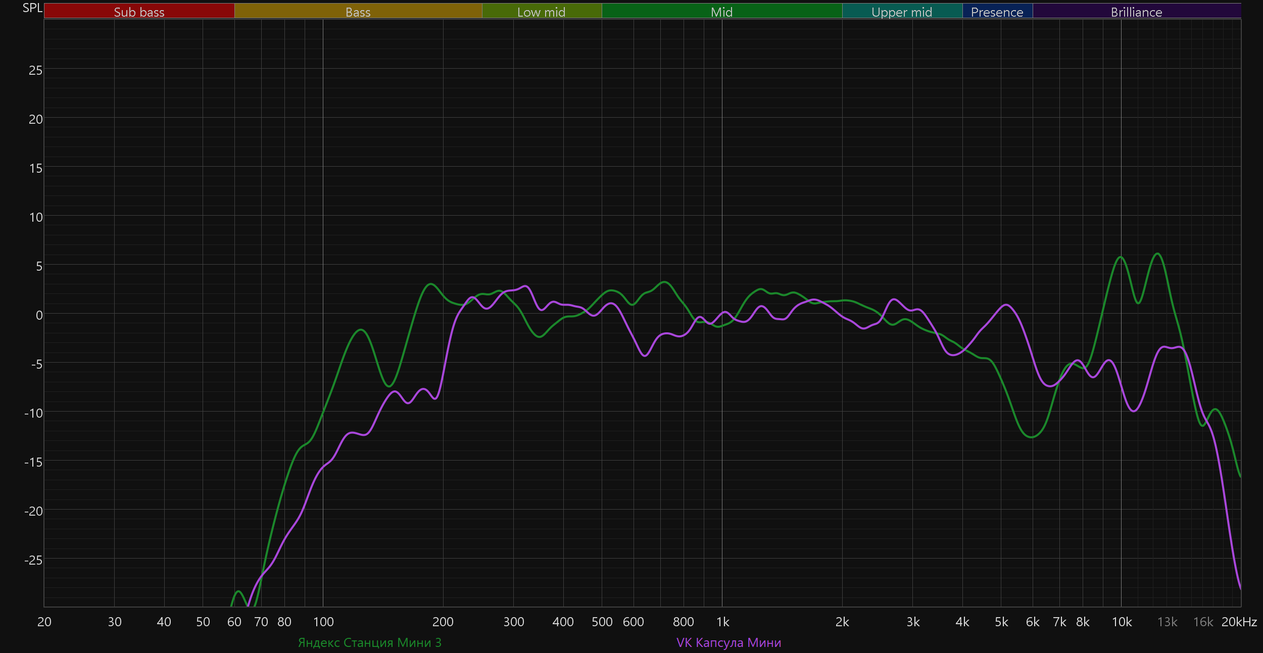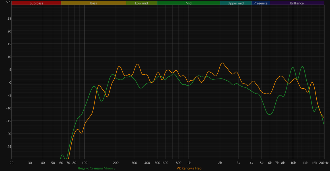 Смарт-колонки VK немножко не дотягивают по НЧ-регистру, но в целом звучат сравнимо. Хотя, «Капсула Мини» всё же выдает несколько более приятную середину. Но тут надо еще раз заметить, что сравниваем мы звучание маленьких колонок с очень скромными возможностями, которые в целом не особо рассчитаны на воспроизведение музыки.