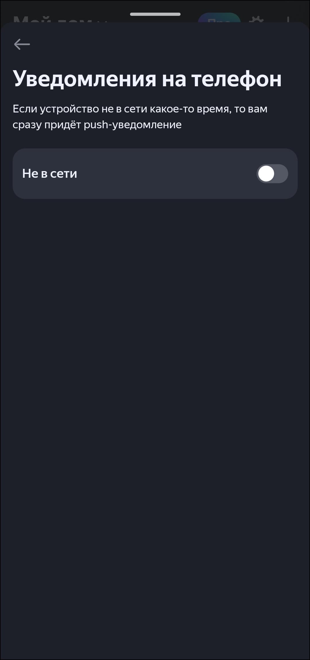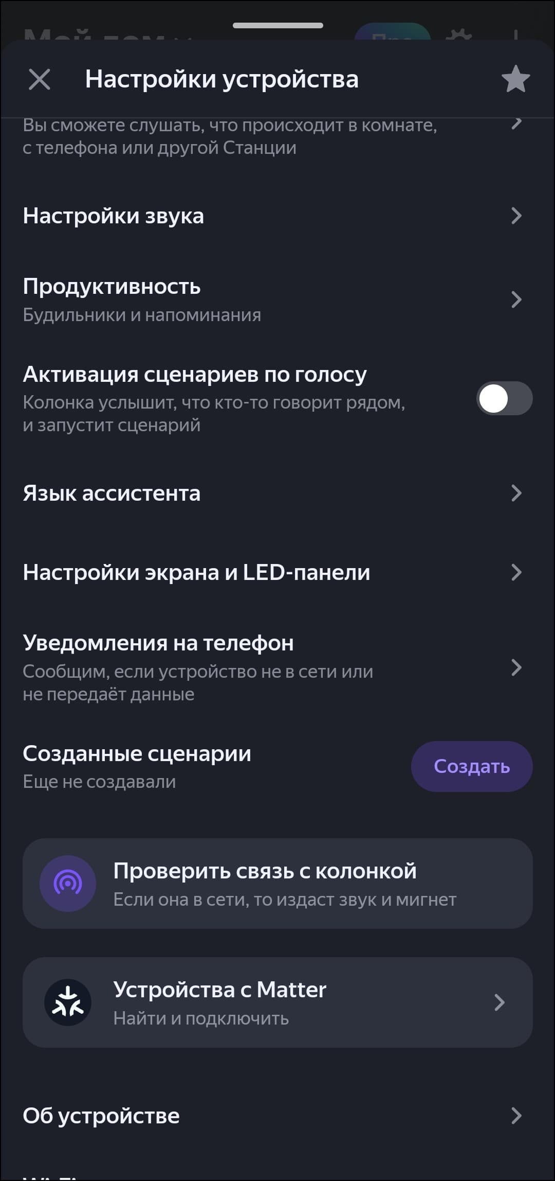 Яркость экрана может настраиваться автоматически, причем делает это довольно корректно. Но если что-то не устраивает, можно изменить ее в ручном режиме, в том числе — «увести в ноль», то есть полностью выключить экран. Если «Станция» вдруг оказалась не в сети, приложение может известить об этом с помощью push-уведомления, также можно проверить связь с колонкой — заставить ее воспроизвести тестовый сигнал.