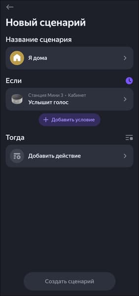 Но самое важное, конечно, далеко не это. Мы очень давно ждали от умного дома «Яндекса» двух вещей, о чем не забывали упомянуть чуть ли не в каждом обзоре новых устройств. Во-первых, очень не хватало поддержки логики «и/или» в сценариях, то есть возможности добавлять более одного условия для выполнения действий. Она появилась вместе с «Яндекс Станцией Лайт 2», в обзоре по ссылке можно найти объяснение того, почему это важно, а также пример реального используемого сценария.