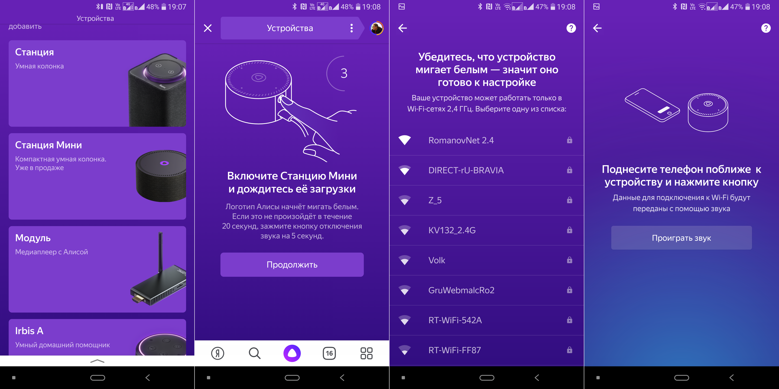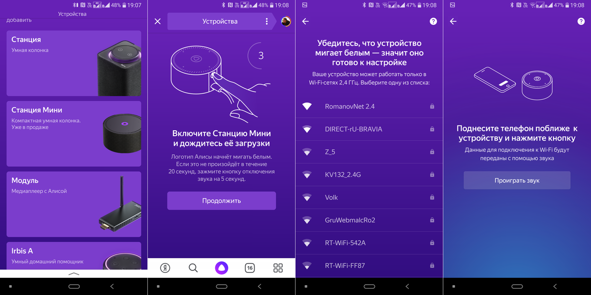 Процесс настройки практически не отличается от того, что мы уже видели у старшей версии. Устанавливаем приложение «Яндекса», переходим в раздел «Устройства», находим там «Яндекс.Станцию Мини». Включаем ее, выбираем сеть для подключения, после чего подносим телефон поближе и нажимаем кнопку продолжить. Телефон некоторое время «общается» с колонкой звуками в стиле R2D2 из «Звездных войн».