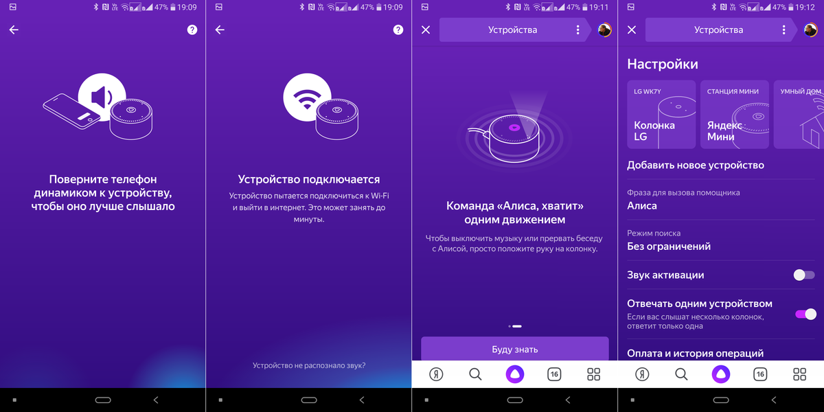 В меню настройки есть опция «Отвечать одним устройством». Теоретически ее включение должно давать следующий результат: если в комнате есть два устройства с Алисой и оба «слышат» слово для активации — отвечает только одно, оно же исполняет данную команду. На практике это срабатывает далеко не всегда. Часто отвечает только первая из подключенных колонок, даже если говорить вплотную к другой — вроде как, функция работает. Но в большой части случаев отвечают обе, после чего начинают мило общаться друг с другом.