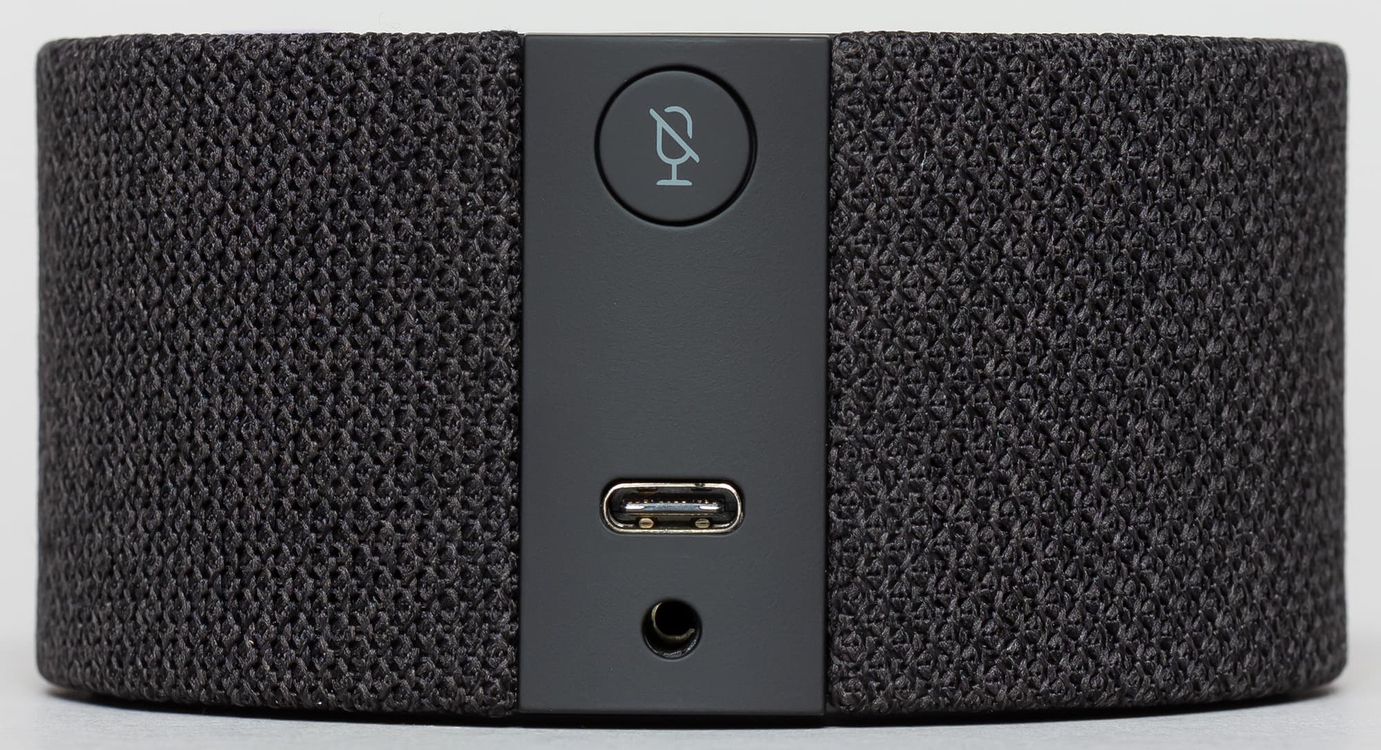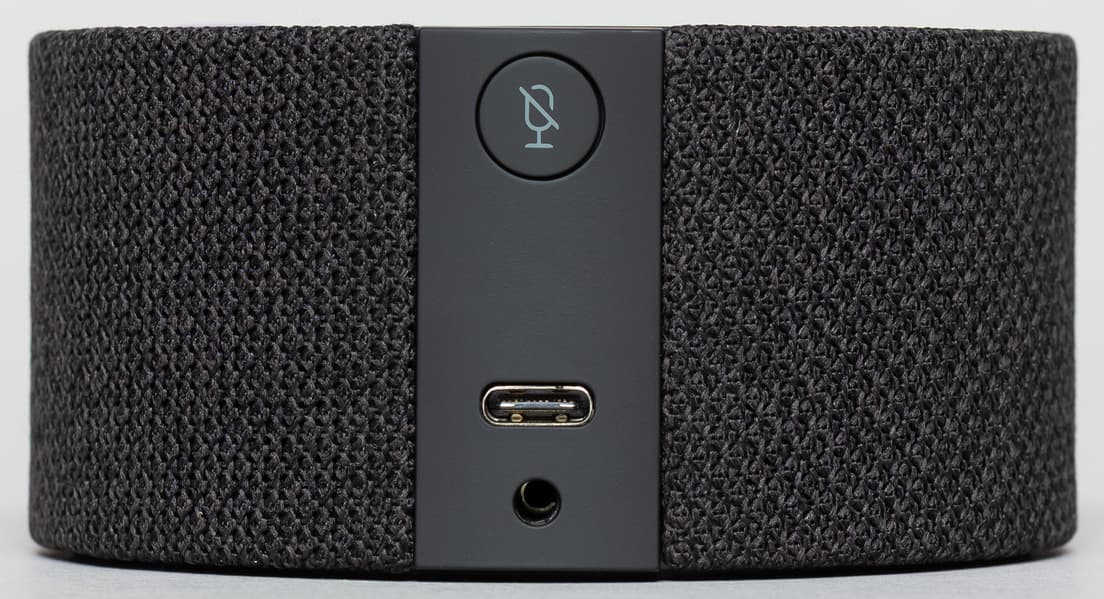 Также на боковой части колонки расположилась небольшая панель с разъемом питания USB Type-C, Aux-выходом миниджек 3,5 мм и единственной кнопкой, которая отвечает за выключение микрофонов.