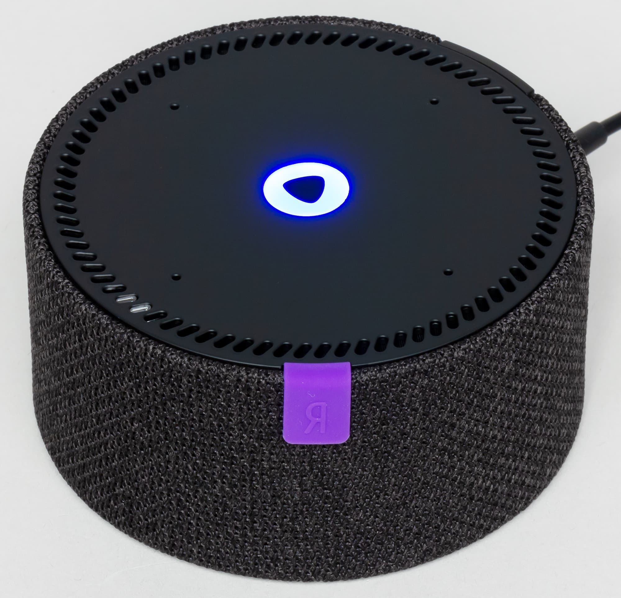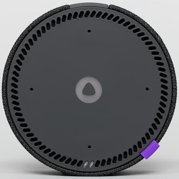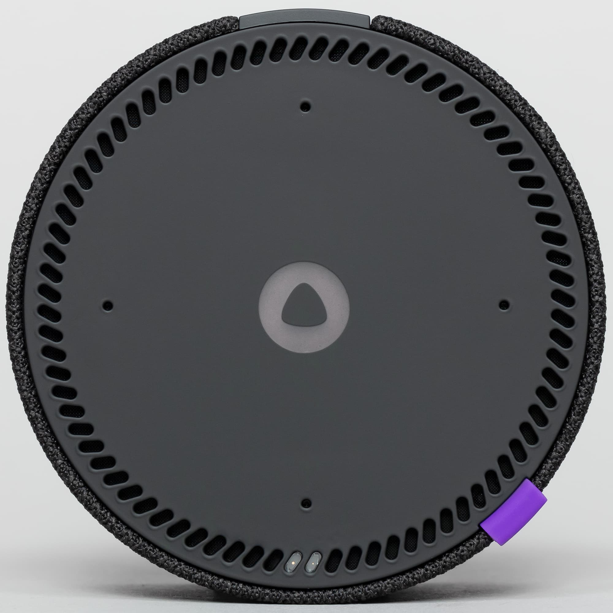 На верхней панели мы видим ряд расположенных по кругу отверстий, под двумя из которых отчетливо различим тот самый TOF-датчик. Чуть ближе к центру расположены четыре отверстия микрофонов, а в середине — индикатор режима работы.