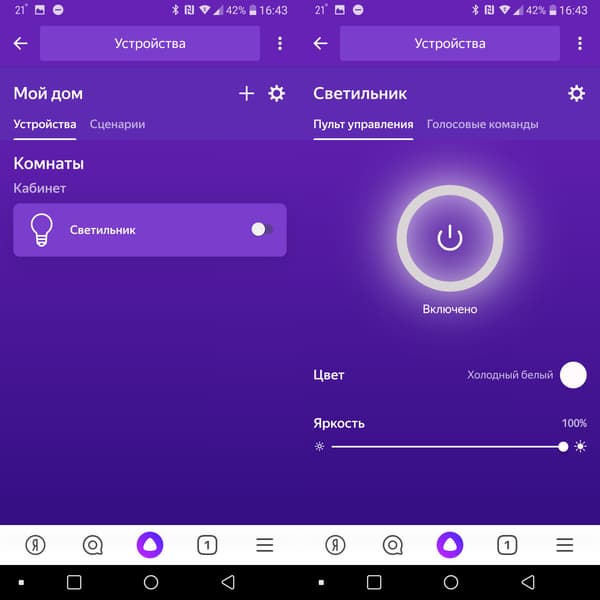 Управление возможно не только с помощью голосовых команд, но и из приложения. Настроек у лампы достаточно много: яркость, цвет, «теплый» и «холодный» режимы.