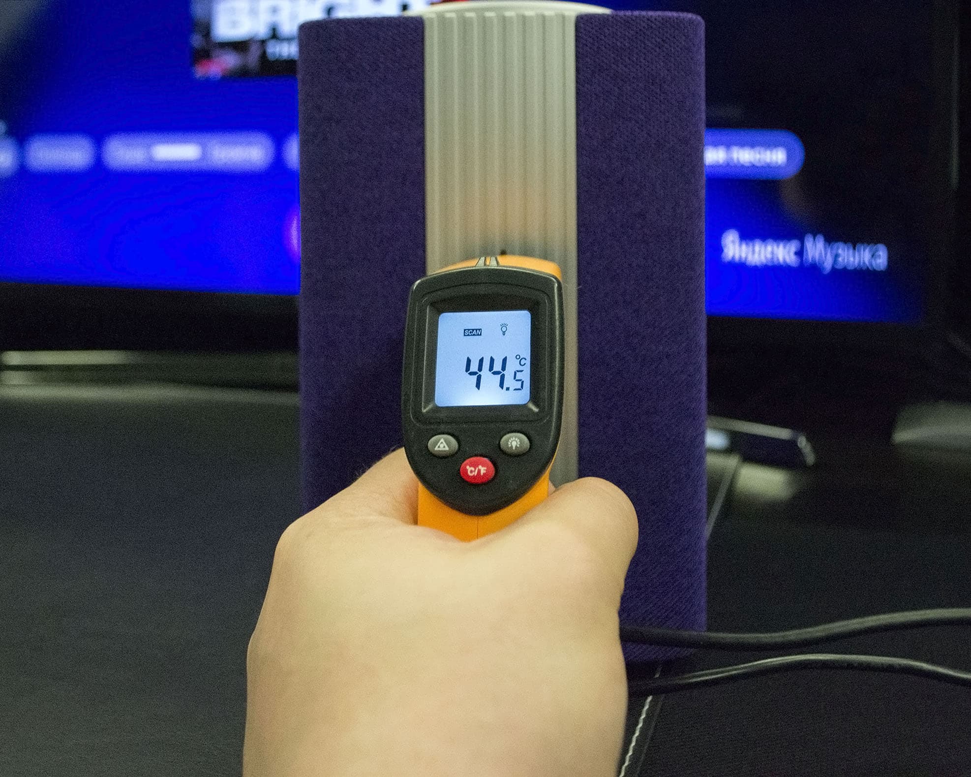 В ходе тестирования даже в случае долговременной работы на громкости выше средней радиатор колонки не нагревался выше примерно 44,5 градусов.