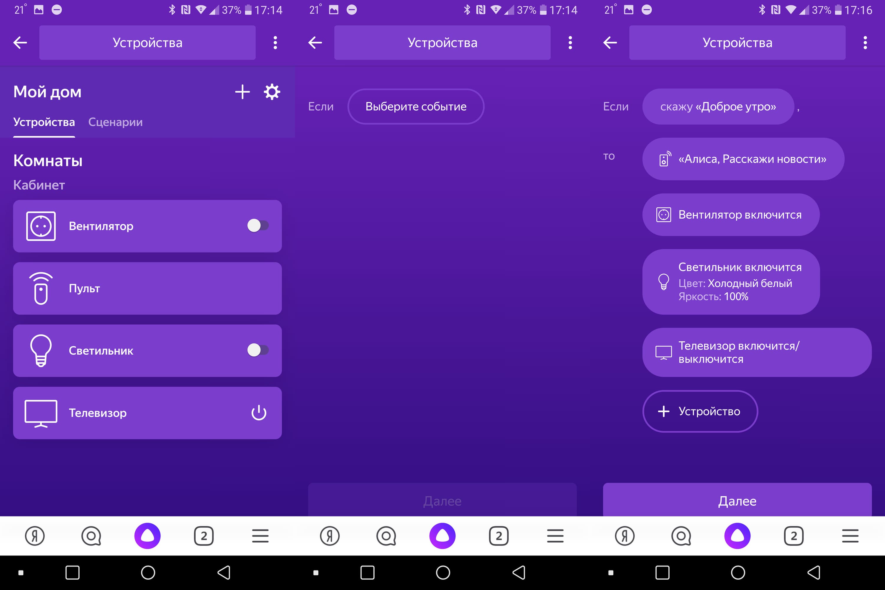 Все действия можно объединять в сценарии. Для этого переходим на страницу комнаты, где собраны подключенные устройства. Нажимаем «+» и выбираем добавление сценария. Далее выбираем событие — нам были доступны только голосовые команды. Но, вероятно, при подключении датчиков, измерительных приборов и других устройств, способных «создавать» события, выбор будет шире. Далее добавляем устройства в список и выбираем, какое действие им нужно совершить.