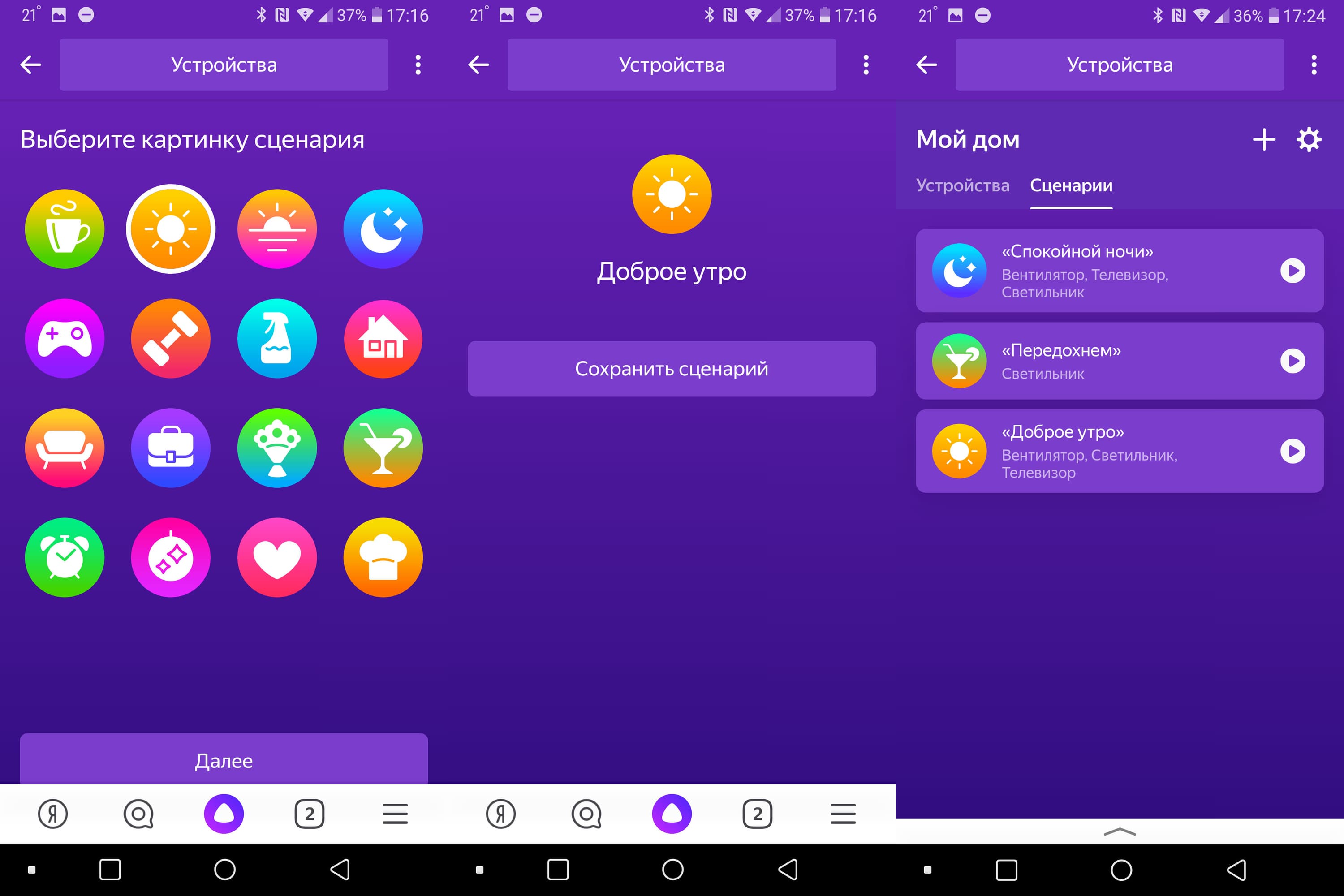 Остается выбрать иконку сценария и сохранить его. Мы для теста создали три сценария, работа которых показана на видео ниже: