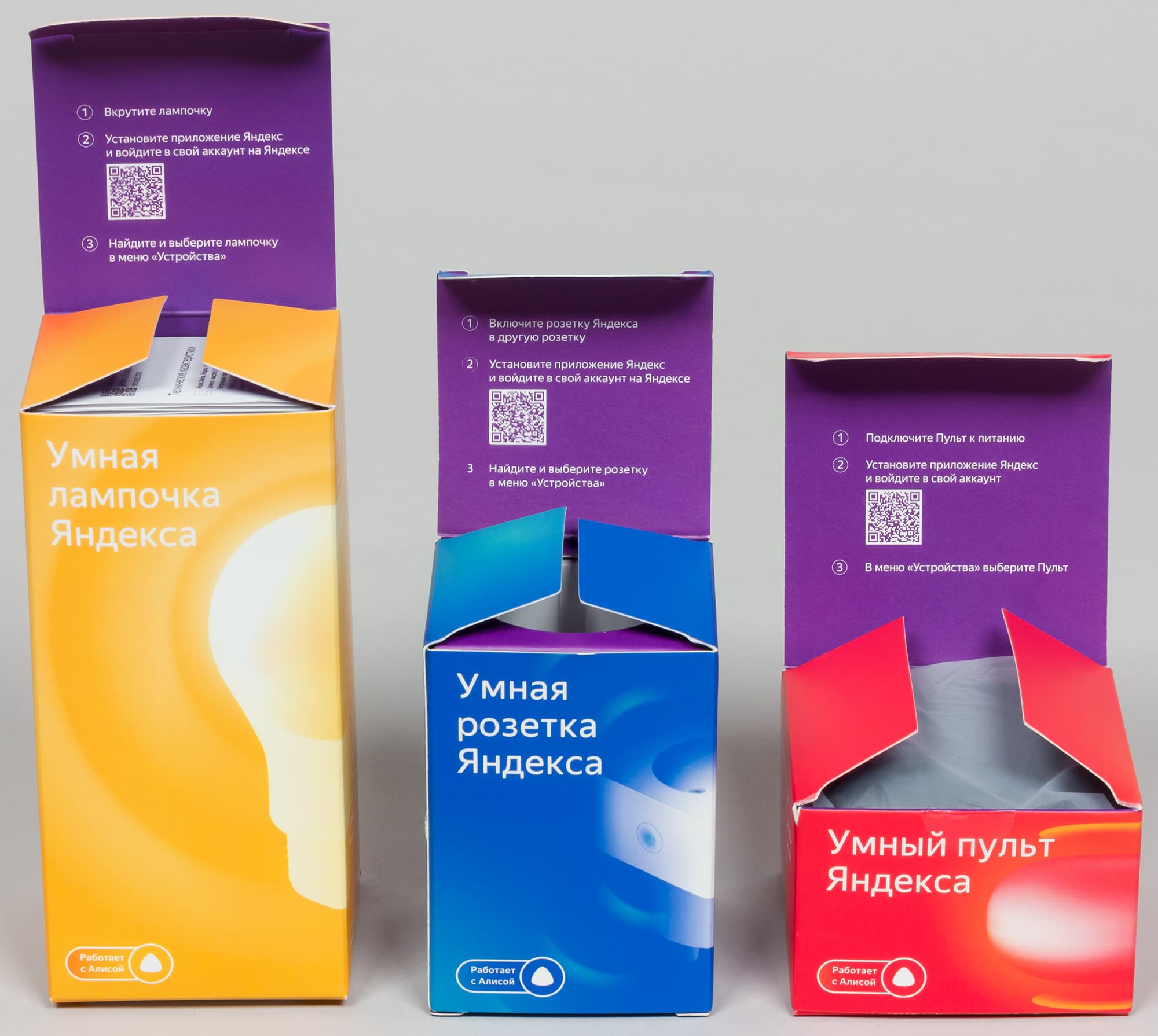 Упаковка «Яндекс.Станции» по уровню исполнения вполне может претендовать на место в премиальном сегменте, тогда как аксессуары для умного дома выполнены максимально просто. Это просто картонные коробки, внутри которых устройства дополнительно защищены картонными же вставками, либо пластиковыми пакетами.