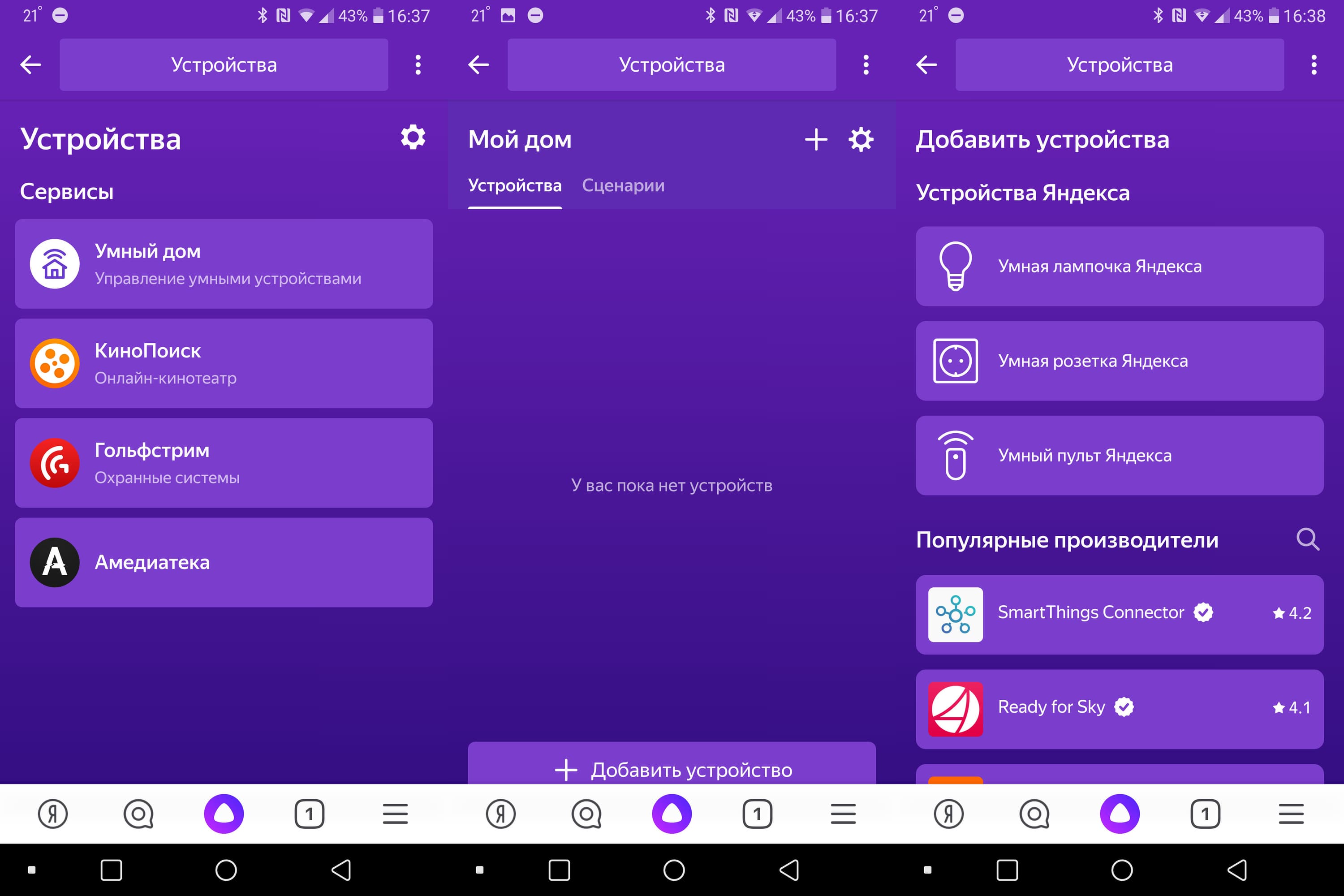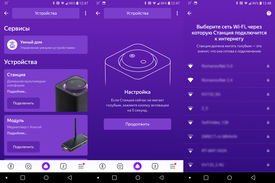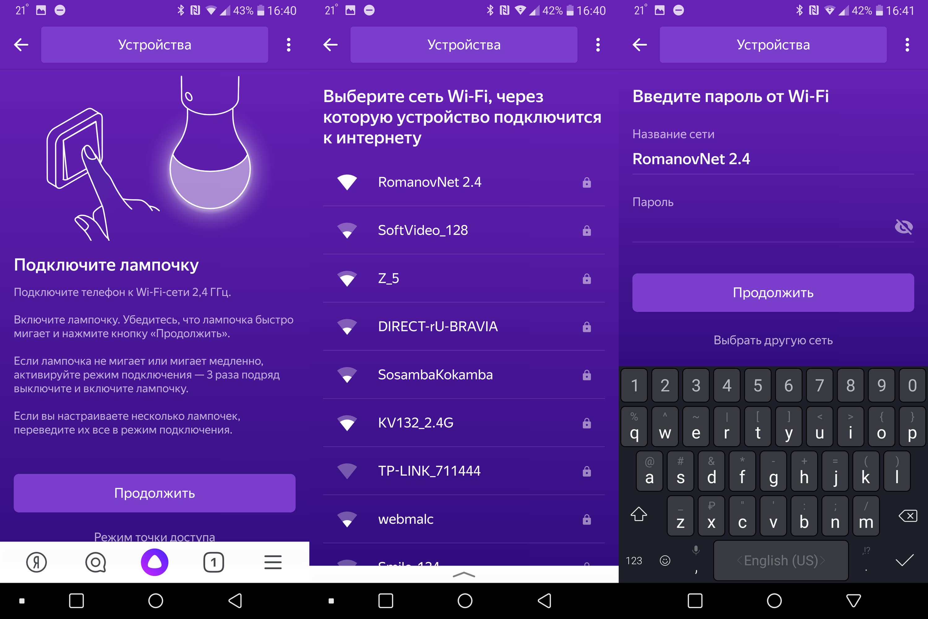 Чуть выше мы говорили о том, что нам так и не удалось подключить «Яндекс.Станцию» к беспроводной сети 5 ГГц. «Умные» же устройства официально поддерживают только сети 2,4 ГГц. Чтобы не возвращаться к этому вопросу, сразу отметим одну важную деталь. При сопряжении устройств мы подключили телефон к сети 2,4 ГГц и получили возможность управлять ими в том числе с его помощью.