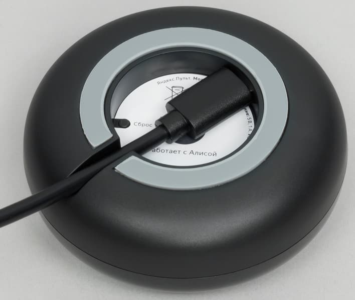В выемке на дне устройства расположены разъем питания, а также кнопка сброса настроек, которая также активирует процесс подключения. Кабель питания укладывается в специально предусмотренное для него углубление.