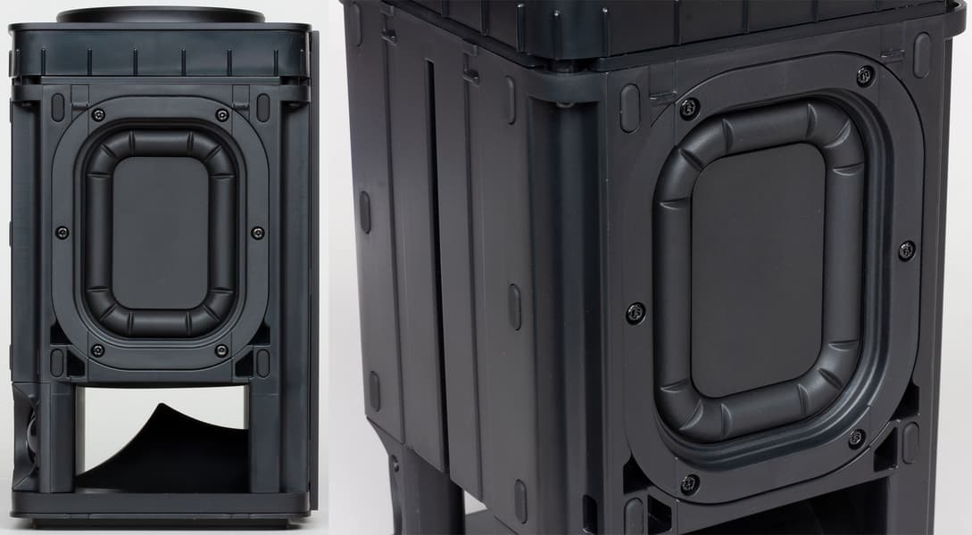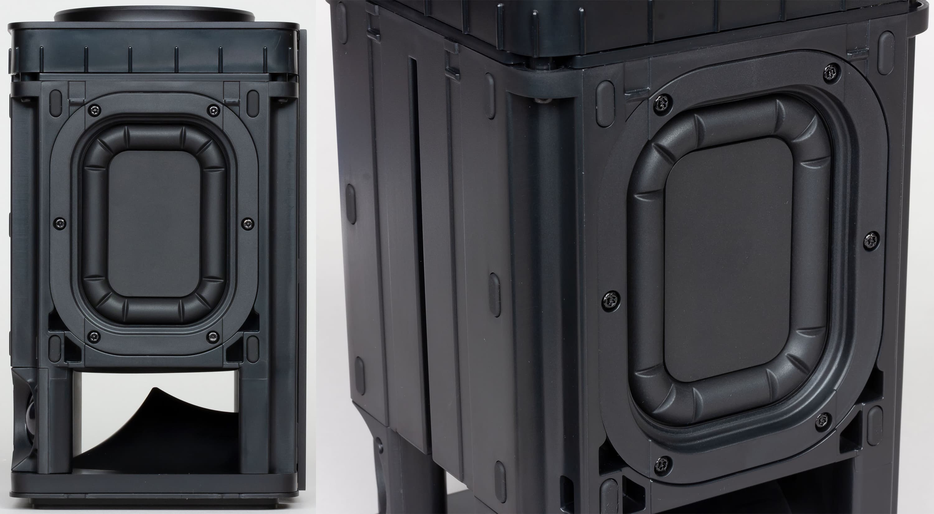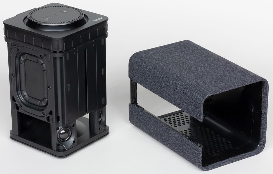 Кожух является съемным. И вот тут есть один очень важный и интересный нюанс. Без кожуха колонка звучит несколько лучше. Но выглядит без него устройство, мягко говоря, странно — видны крепежные элементы и вспомогательные детали. Да и динамики в таком виде повредить очень просто, а гарантия на такие случаи не распространяется. Дошло до того, что пользователи создают и даже продают кастомные кожухи, позволяющие улучшить звучание. А в сети можно найти модель для самостоятельной печати основы кожуха на 3D-принтере.