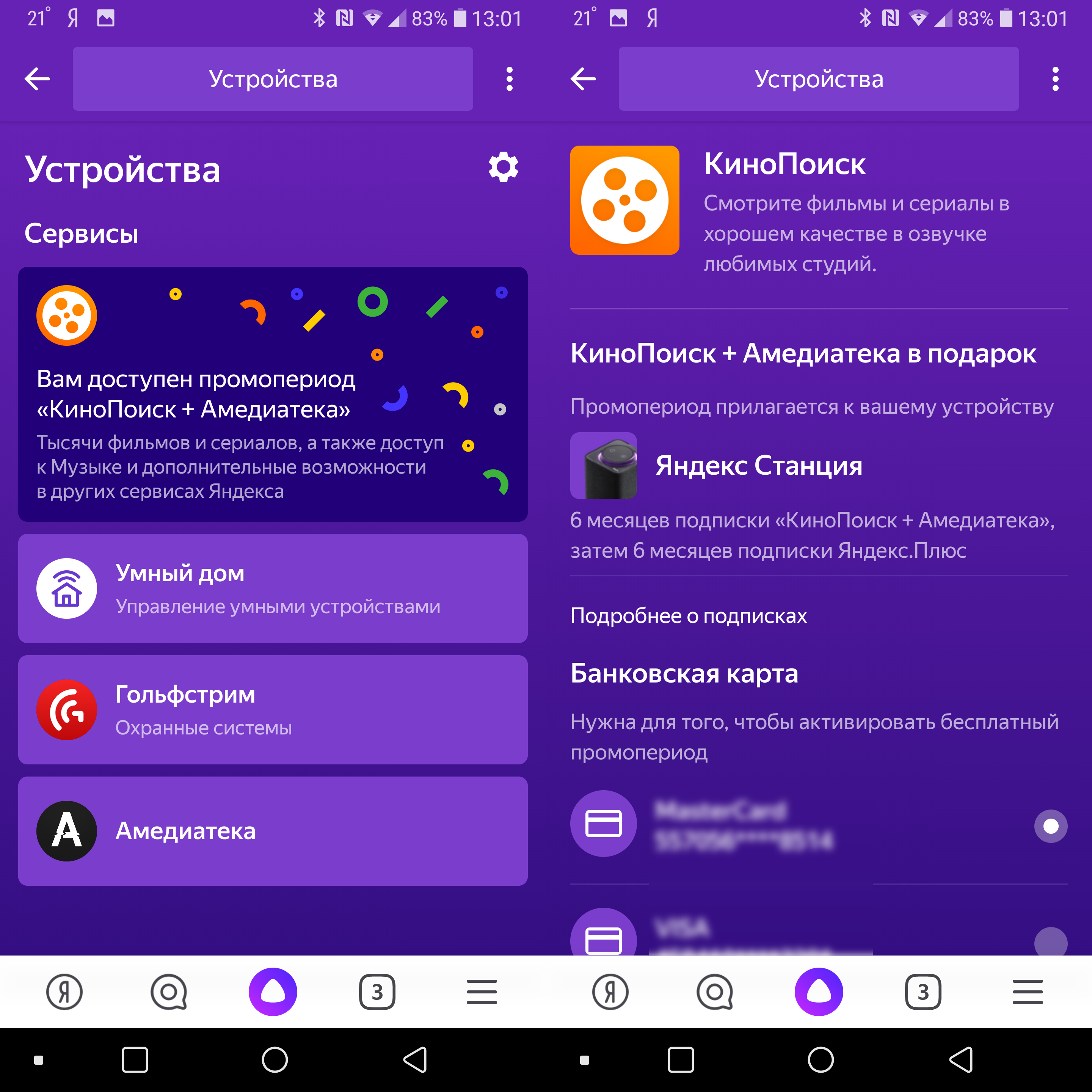 Основными источниками контента для «Яндекс.Станции» служат собственные сервисы компании — «Яндекс.Музыка» и «Кинопоиск», предоставляющий совместную подписку с «Амедиатекой». Подписка на них — по сути, часть первоначальной настройки устройства. Без них оно не реализует и половины своих возможностей. К счастью, первоначальное пользование сервисами входит в цену устройства. Нам после авторизации было предложено активировать подписку «Кинопоиск + Амедиатека» на полгода, а потом «Яндекс.Плюс» — еще на полгода.