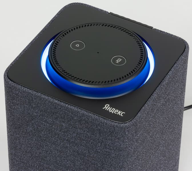 Все управление сосредоточено на верхней панели, где расположен регулятор громкости со светодиодным кольцом, отображающим состояние и режим работы устройства. По центру регулятора находятся две кнопки — активации голосового помощника и выключения микрофона.