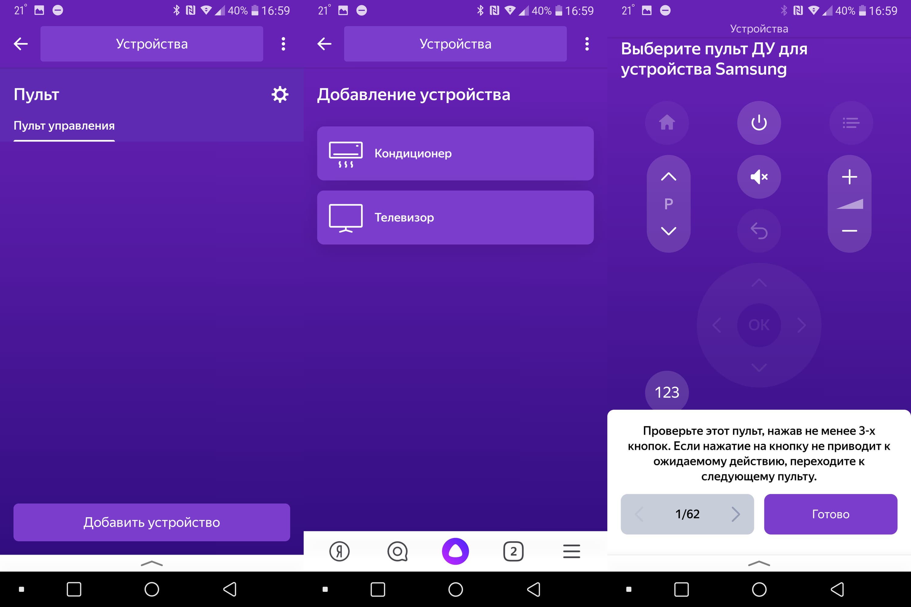 Разработчики «Яндекса» пошли другим путем. Они добавили в приложение шаблоны для достаточно широкого списка устройств. Но, естественно, далеко не для всех. Пока доступно лишь управление кондиционерами и телевизорами ведущих производителей. В инструкции прямо написано, что команды управления могут пересекаться у разных устройств и нужный шаблон можно подобрать простым перебором. Это требует некоторого количества времени и терпения, но теоретически возможно.