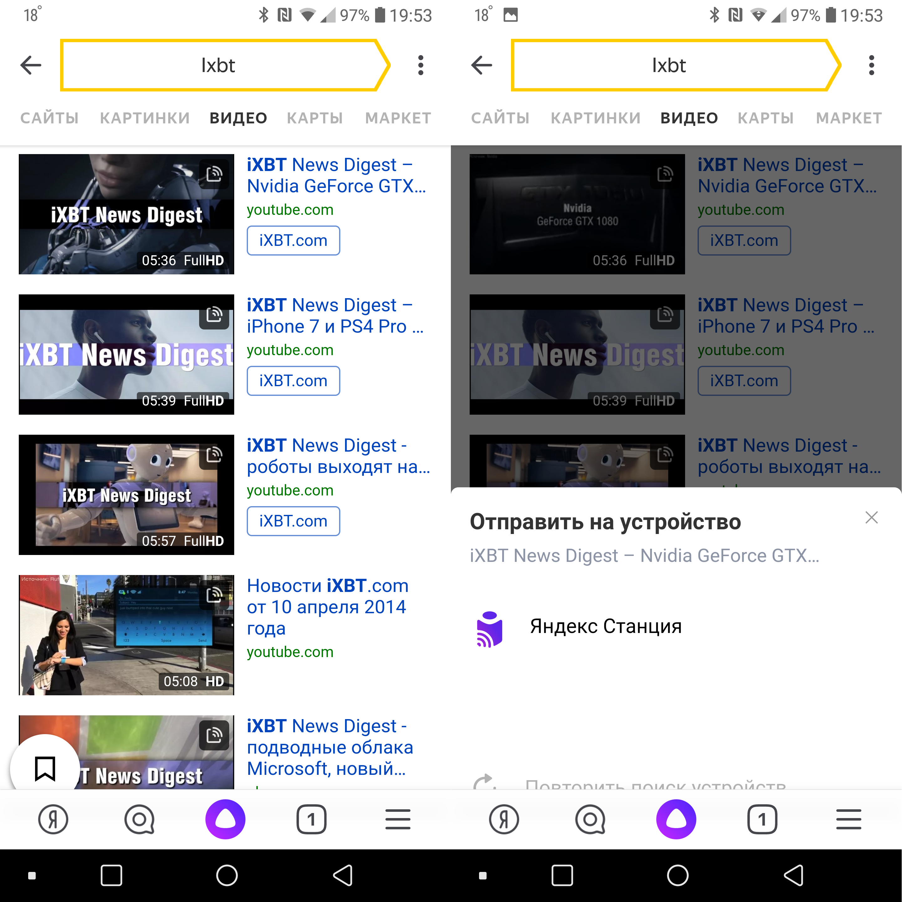 Найти нужное видео по имени канала и названию удается — уже хорошо. А вот посмотреть перечень своих подписок, например, не получится. Зато появилась возможность «перекидывать» видео из поиска в браузере на «Яндекс.Станцию». Выбираем нужный ролик в поиске, нажимаем на иконку в правом верхнем углу превью, тапаем на название устройства — смотрим. Для того, чтобы опция была доступна, достаточно быть авторизованным под одним логином на обоих устройствах.
