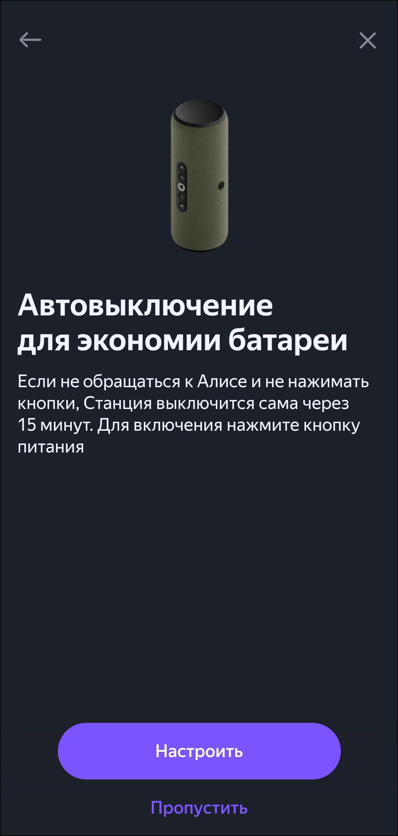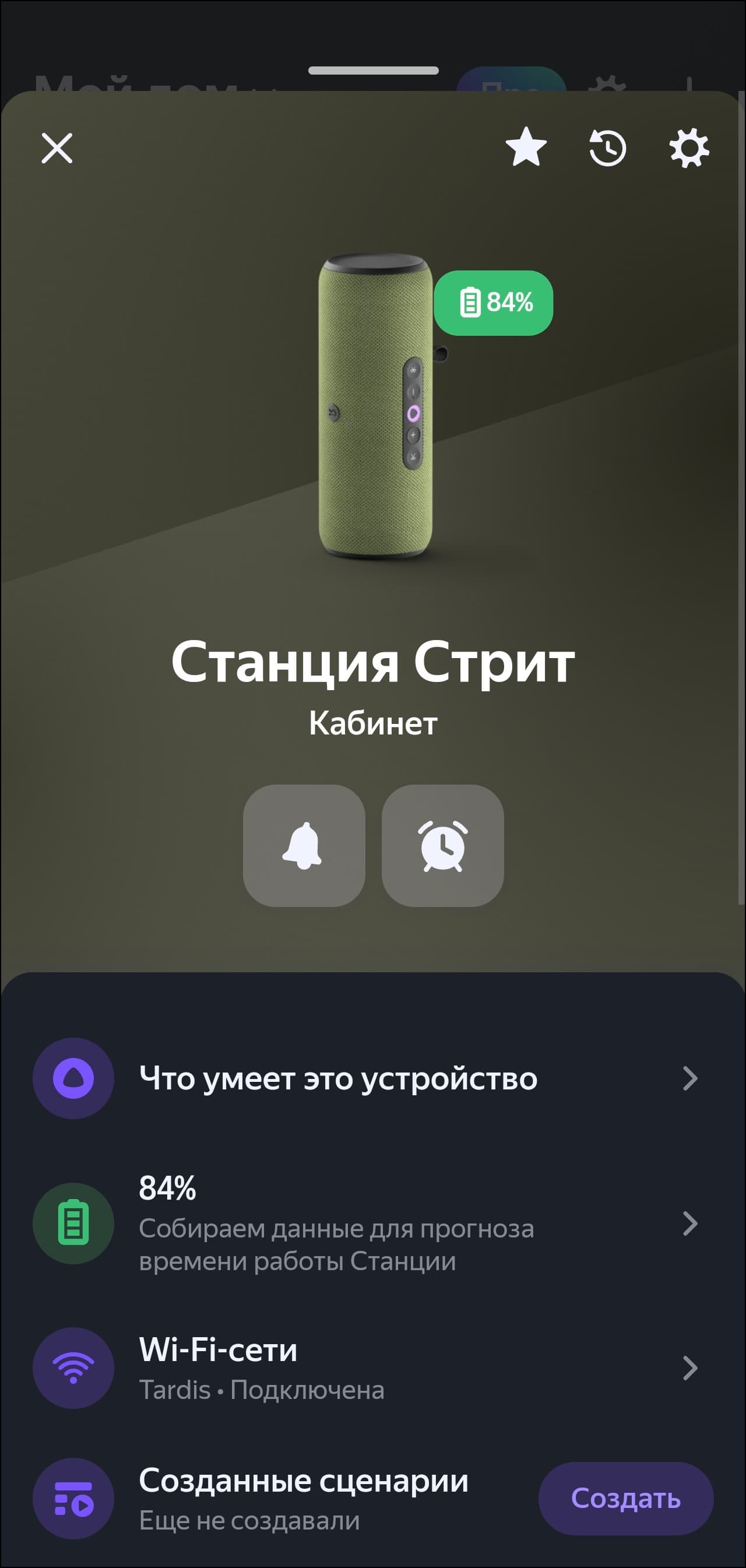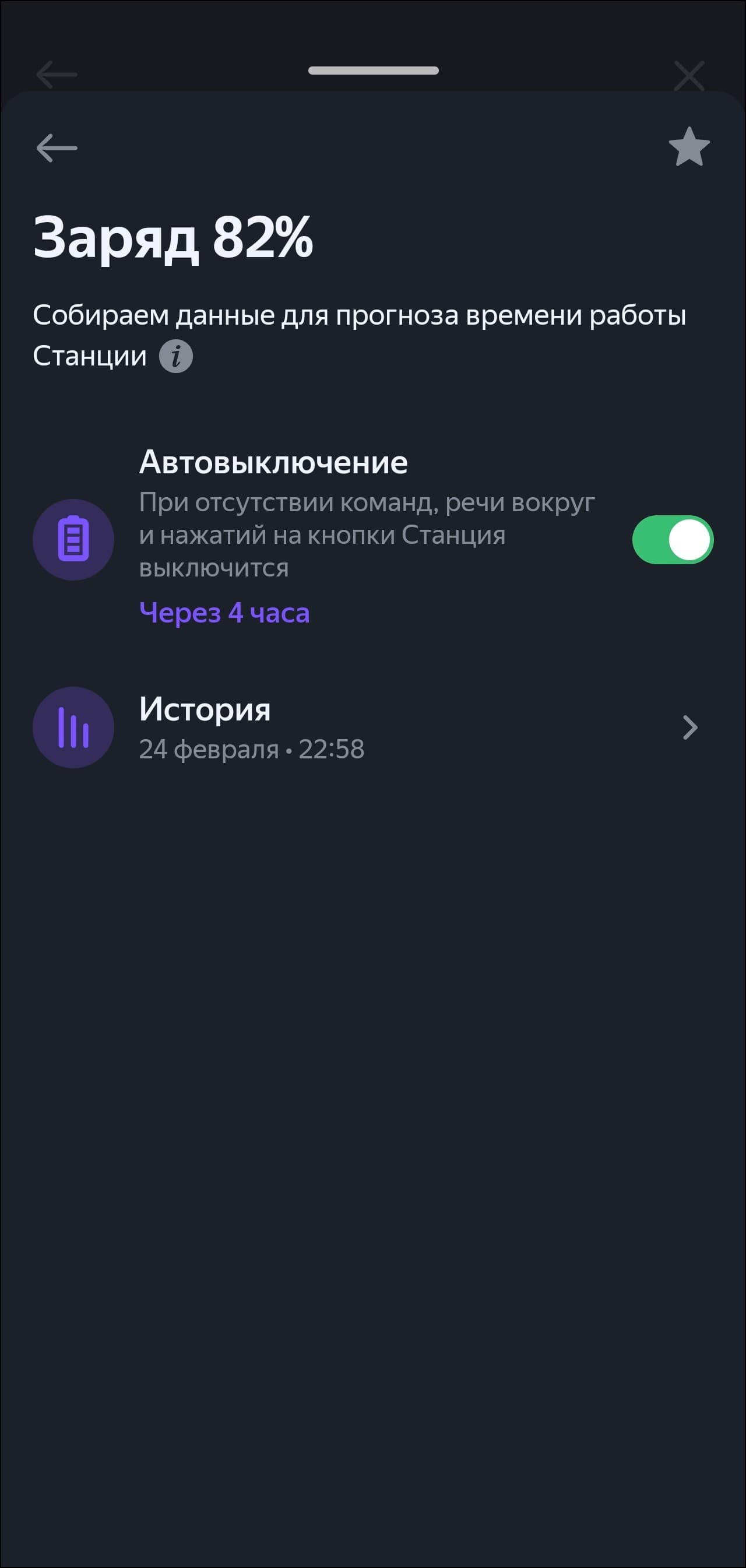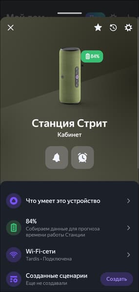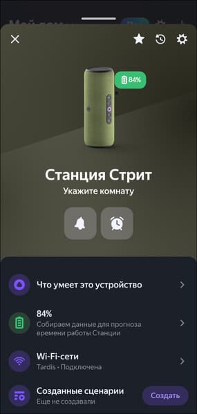 С появлением аккумулятора в колонке появилась и необходимость в автоматическом отключении для экономии заряда: «Станция Стрит» по умолчанию отключается после 15 минут бездействия, но это время можно изменить, либо вообще отключить данную опцию. В наследство от стационарных смарт-колонок ей досталась возможность «привязки» к какому-нибудь помещению внутри дома. Уровень заряда аккумулятора в приложении отображается в процентах, также предусмотрена возможность прогнозировать примерную длительность работы колонки, которая рассчитывается с учетом текущей громкости и используемых подключений.