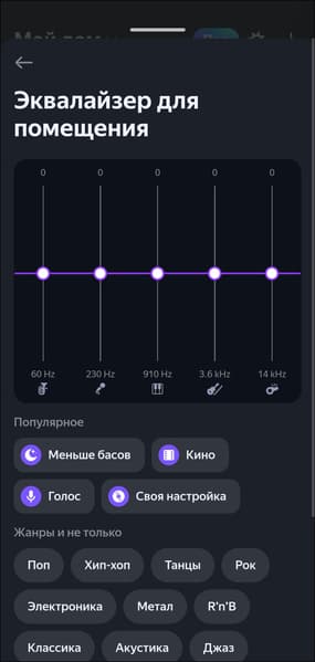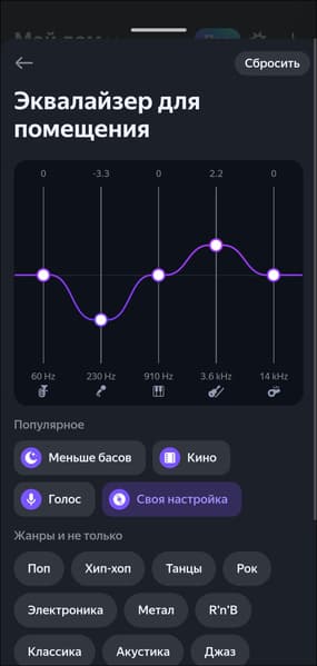 О режимах звучания мы уже говорили. Кроме них, предусмотрен эквалайзер — с набором готовых пресетов и возможностью настроить звук вручную с помощью пяти полос. Прямо скажем, немного, но уже хорошо. Однако, как и в других смарт-колонках «Яндекса», эквалайзер не работает при подключении по Bluetooth. Если для стационарных устройств это можно было считать нормой, то в случае с портативной колонкой — это уже ощутимый минус: воспроизведение музыки через Bluetooth здесь является одним из ключевых сценариев использования.