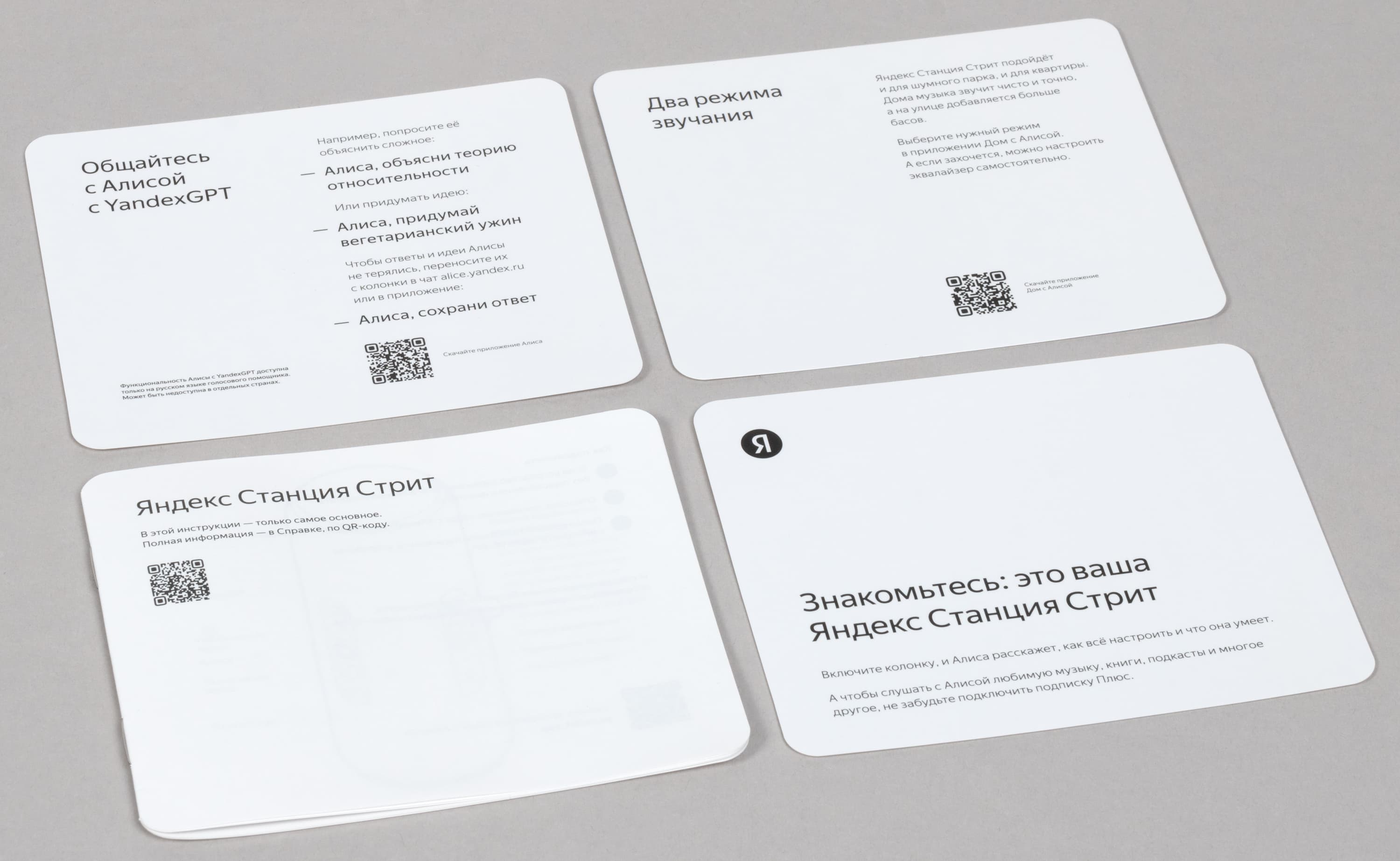 Документации в комплекте вдосталь — базовую информацию можно почерпнуть прямо из нее, но если хочется узнать о колонке чуть больше, стоит пройти по многочисленным ссылкам (QR-коды помогут сделать это проще и быстрее).