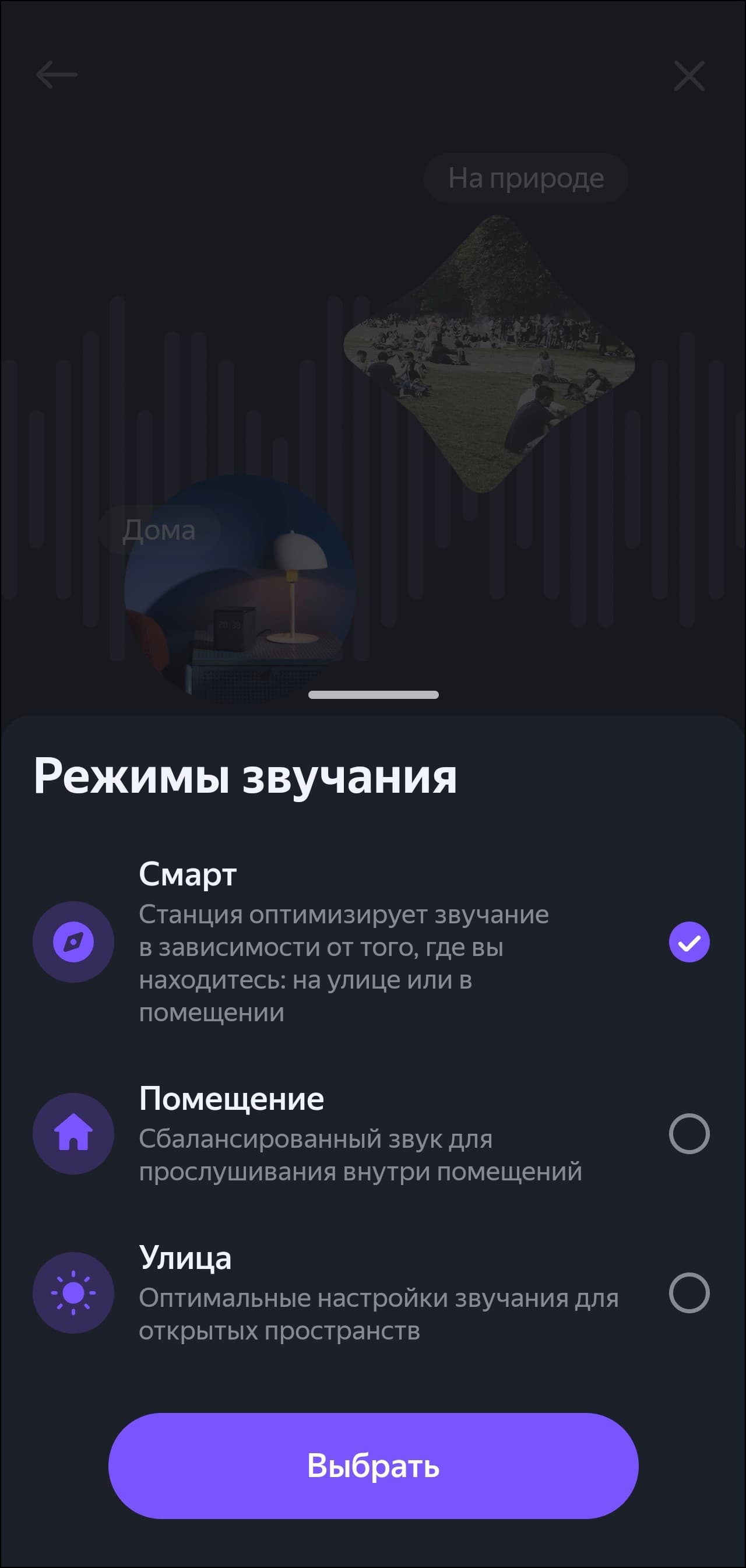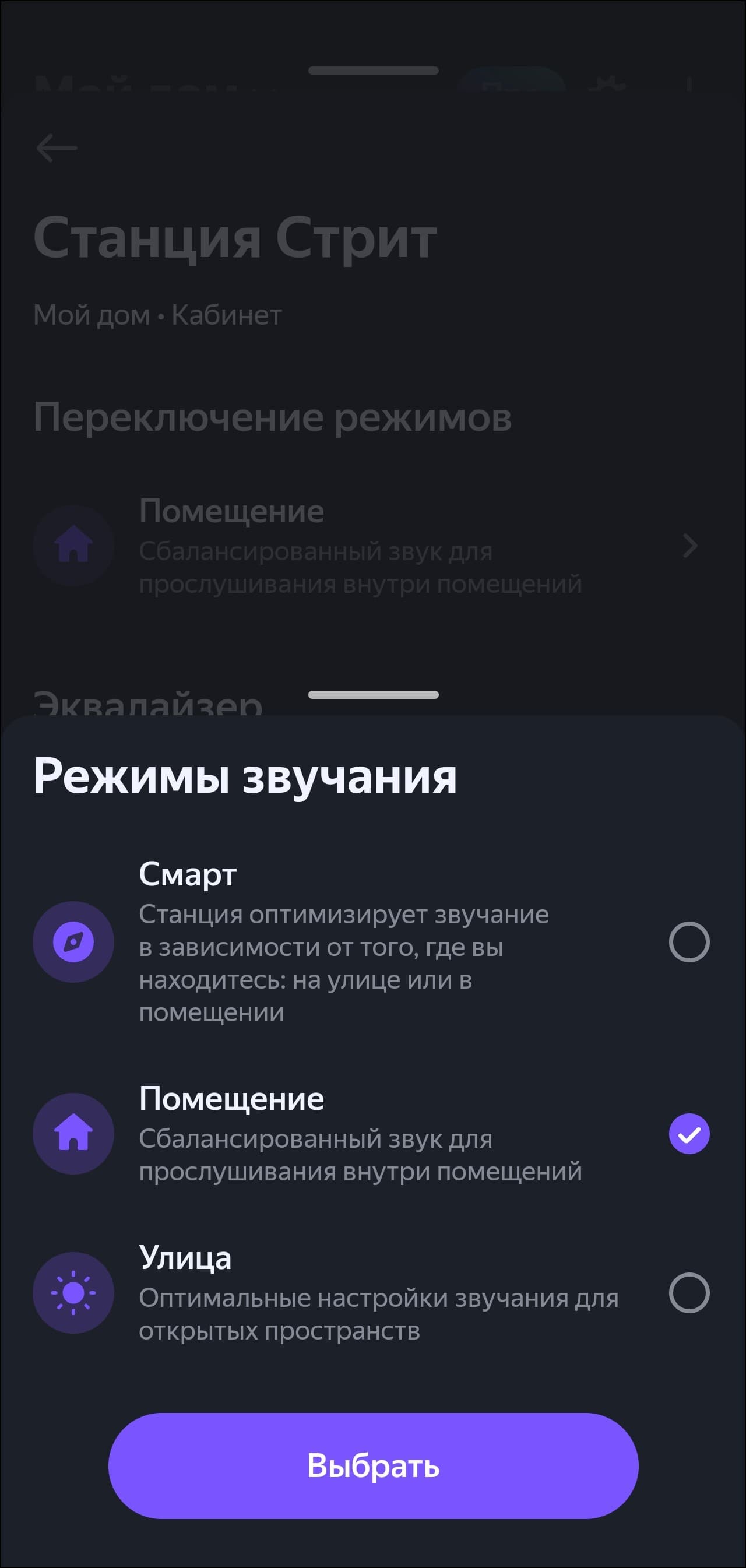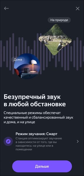 Сразу после подключения приложение предлагает осуществить первоначальную настройку устройства. Стоит уделить этому пару минут — колонка сразу начнет работать как надо, а заодно появится возможность познакомиться с ее ключевыми функциями. В частности, «Станция Стрит» умеет определять, находится ли она на улице или в помещении, и автоматически подстраивает параметры эквалайзера. В режиме «Смарт» это происходит само, но при желании можно выбрать нужный режим вручную.