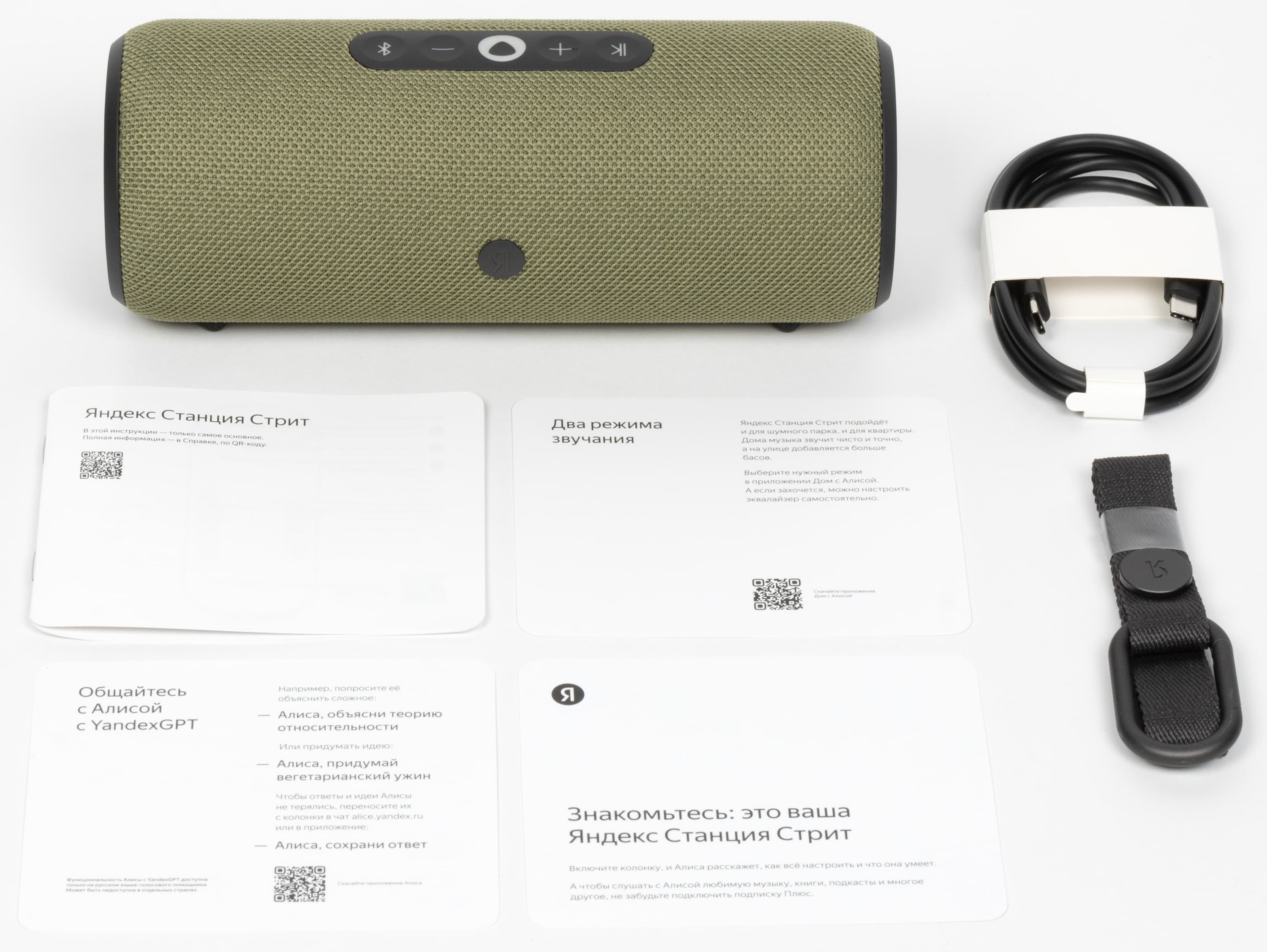 В комплект поставки, помимо самой колонки, входят документация, кабель для питания и зарядки, а также съемный ремешок.