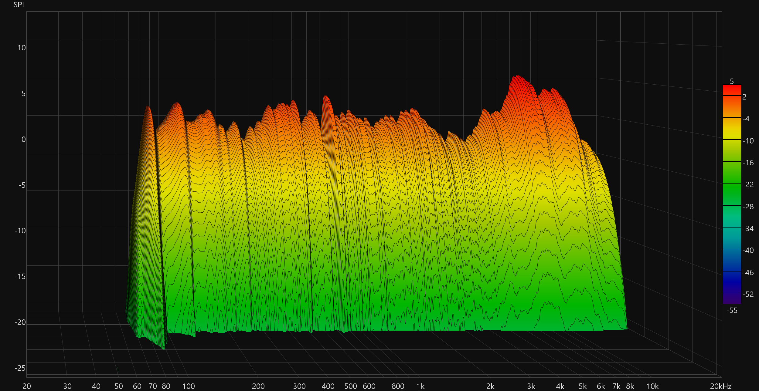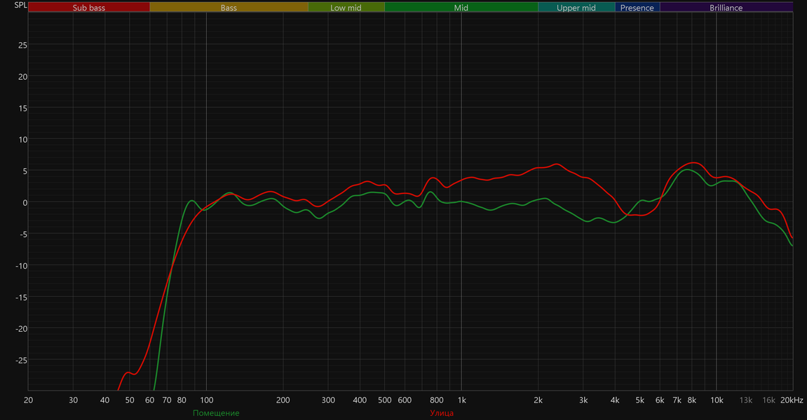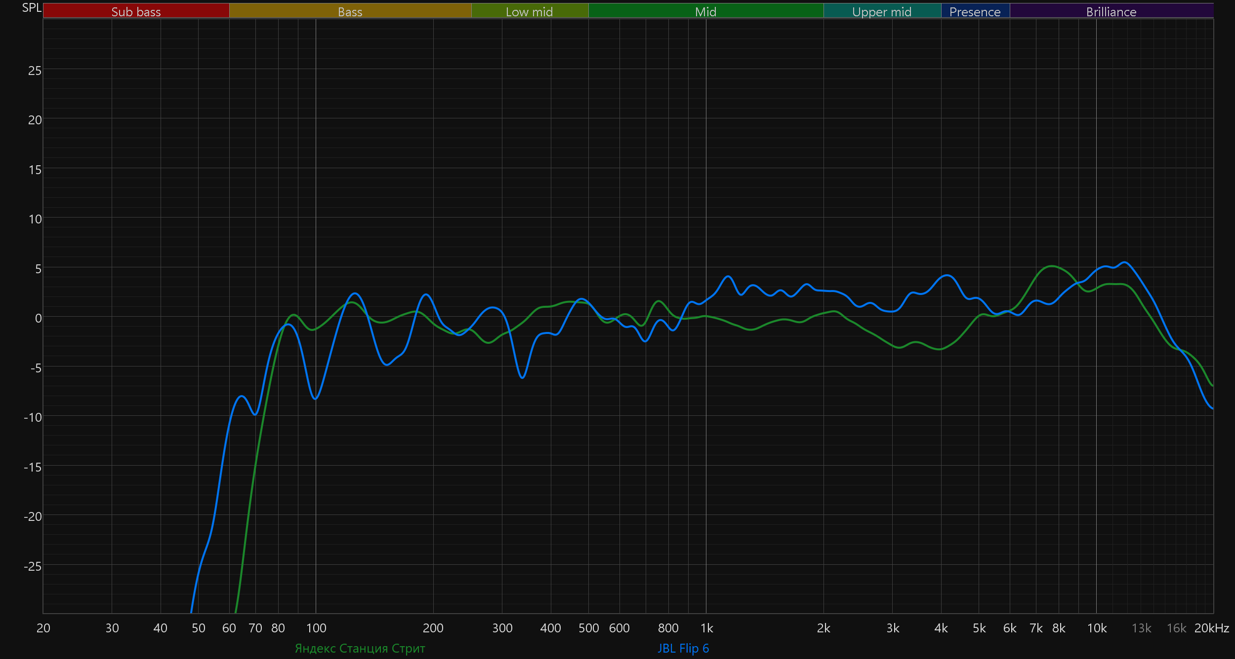 НЧ-диапазон лишен дополнительных акцентов и подается довольно сдержанно — сказывается нестандартное размещение пассивных излучателей, которое отличает «Станцию Стрит» от большинства привычных бочкообразных портативных колонок. Зато бас звучит плотно, без излишнего «гудения и бубнения», с хорошей атакой, что подтверждается графиком кумулятивного затухания спектра (он же «водопад» или waterfall).