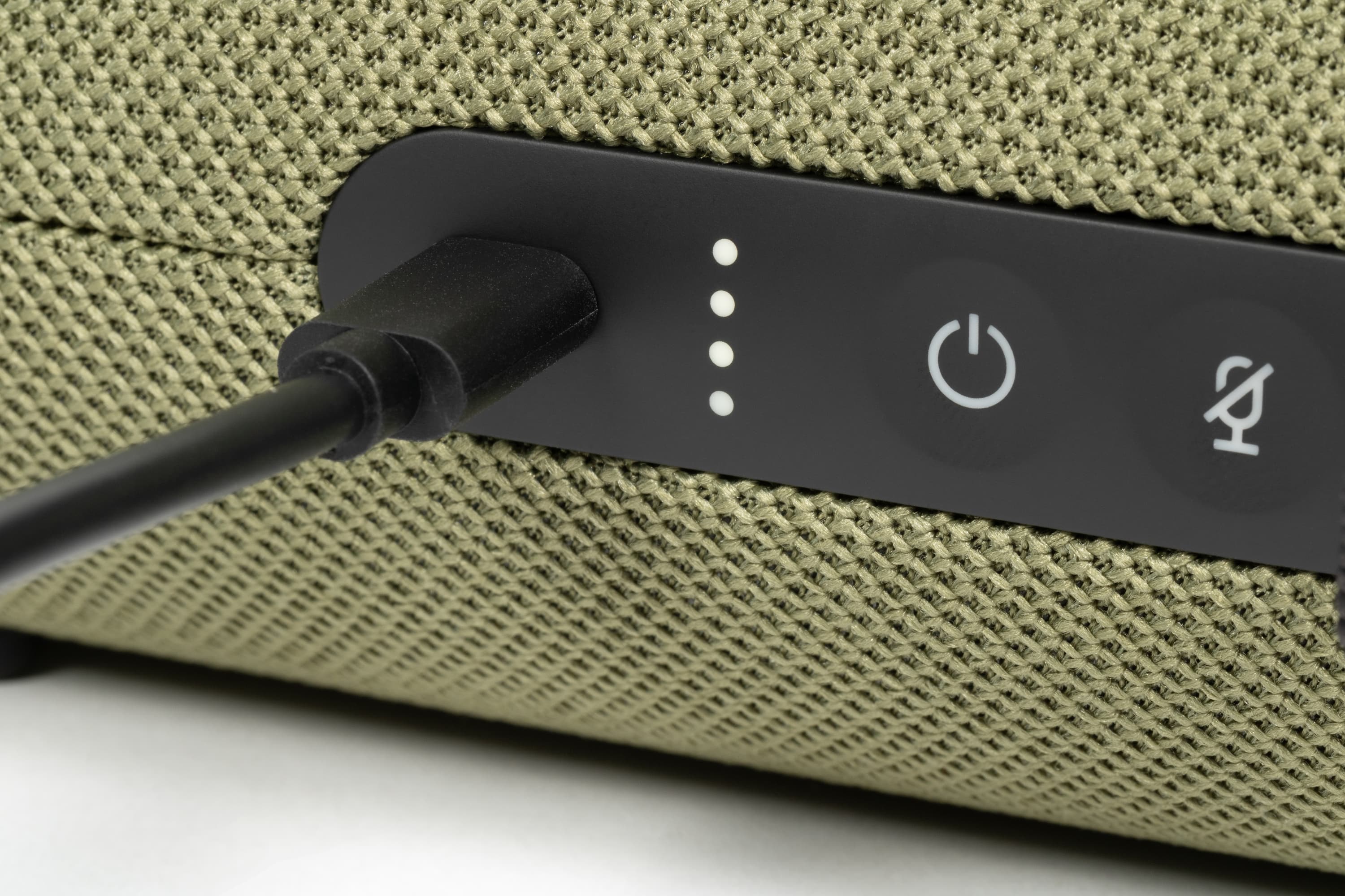 Подавляющее большинство производителей размещает по бокам колонки пассивные излучатели, расширяющие их возможности в области воспроизведения баса. Разработчики «Станции Стрит» пошли другим путем: торцы закрыты матовыми пластиковыми накладками. При этом, по словам разработчиков, пассивные излучатели все же есть, но размещены как-то иначе. В любом случае, это довольно смелое решение, которое явно сказалось на звуке — как именно, разберемся чуть ниже. Основная часть корпуса обтянута плотной тканью. Она устойчива к загрязнениям, неплохо очищается и, по заявлению производителя, не выгорает на солнце. В месте стыка тканевой обтяжки — на условной «задней стенке» — расположена небольшая панель с портом USB-C для зарядки, индикатором заряда аккумулятора, кнопками питания и отключения микрофона, а также миниатюрной петлей для крепления карабина ручки.