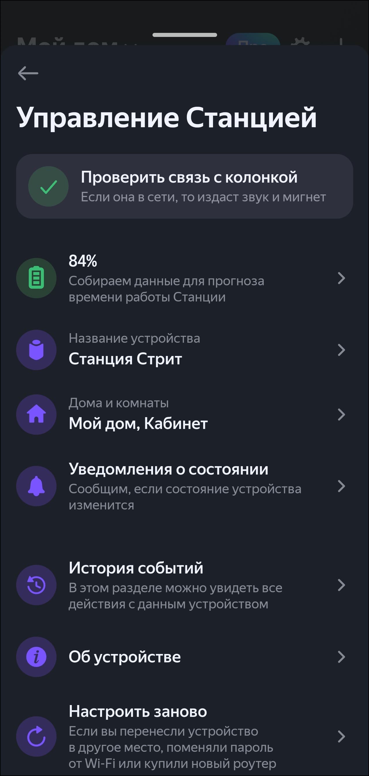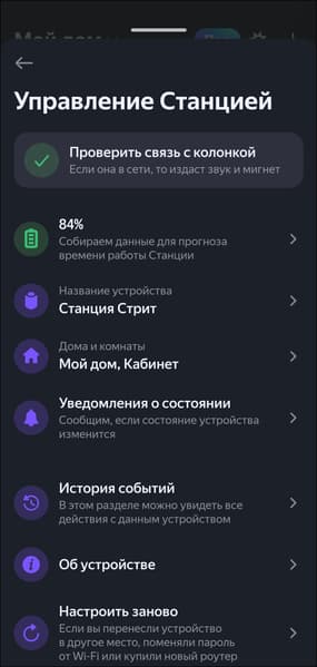 Большинство настроек выполняется через приложение. Для управления колонкой важно, чтобы она была добавлена в аккаунт и подключена к сети. Основной набор настроек универсален для всех смарт-колонок «Яндекса» — на них подробно останавливаться не будем. Скажем лишь, что после добавления в аккаунт «Станция Стрит» становится полноценной частью умного дома: через нее можно управлять устройствами, общаться с Алисой и так далее.