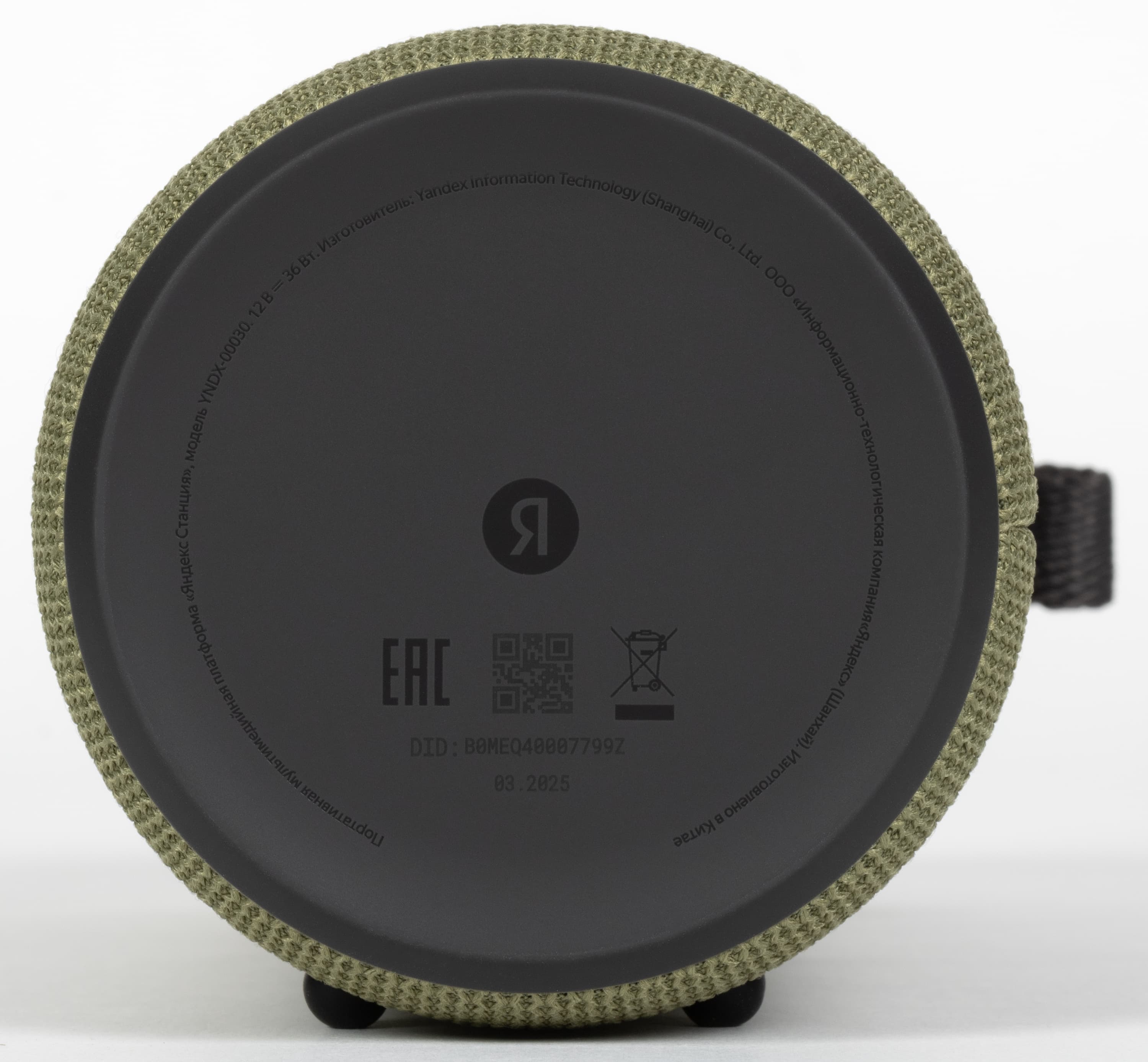 Ручка-ремешок порадовала отдельно. Выполнена она из мягкой и приятной на ощупь, но при этом прочной стропы, разделенной на две петли симпатичной круглой вставкой с логотипом «Яндекса». На одном конце закреплен сравнительно крупный металлический карабин с матовым покрытием. Другой образует петлю, размеры которой достаточны и для ношения на крупном мужском запястье, и для того, чтобы повесить колонку на что-нибудь. При этом карабин можно использовать отдельно — например, чтобы закрепить устройство на лямке рюкзака. В общем, всё максимально удобно и продуманно.