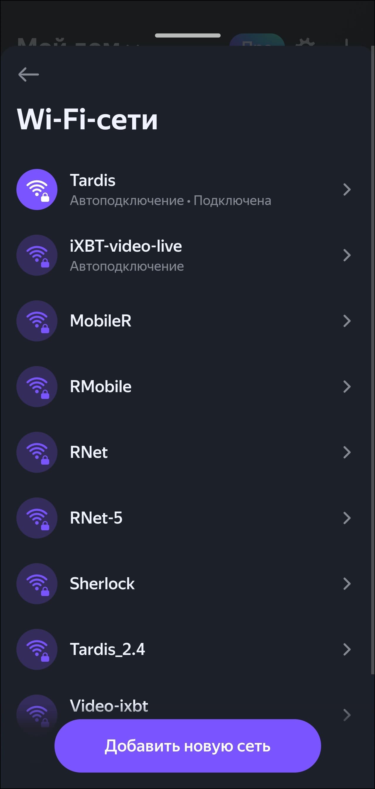 Процесс добавления новой сети сделан максимально простым: достаточно зажать кнопку отключения микрофона на 6 секунд и дождаться, пока центральный индикатор не начнет мигать белым, а Алиса не предложит подключиться к интернету (также процесс можно запустить из приложения). После этого остается просто добавить нужную сеть — она появится в общем списке и будет готова к использованию.