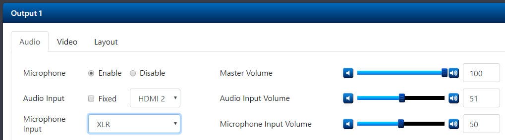 Ниже расположены два блока, один над другим — Output 1 и Output 2. Каждый из блоков содержит собственные вкладки Audio, Video и Layout (макет, раскладка). Здесь производится детальная настройка микшируемых и/или записываемых/транслируемых потоков. Например, из выпадающего списка Audio Input можно выбрать дополнительный источник звука, помимо того, который поступает вместе с видео по HDMI. Здесь же включается/отключается микрофонная линия с выбором микрофонного входа: XLR либо 3,5 мм. Каждый выбранный источник звука имеет собственную регулировку уровня, выполненную в виде обычного ползунка с дополнительным окошком ввода процента.