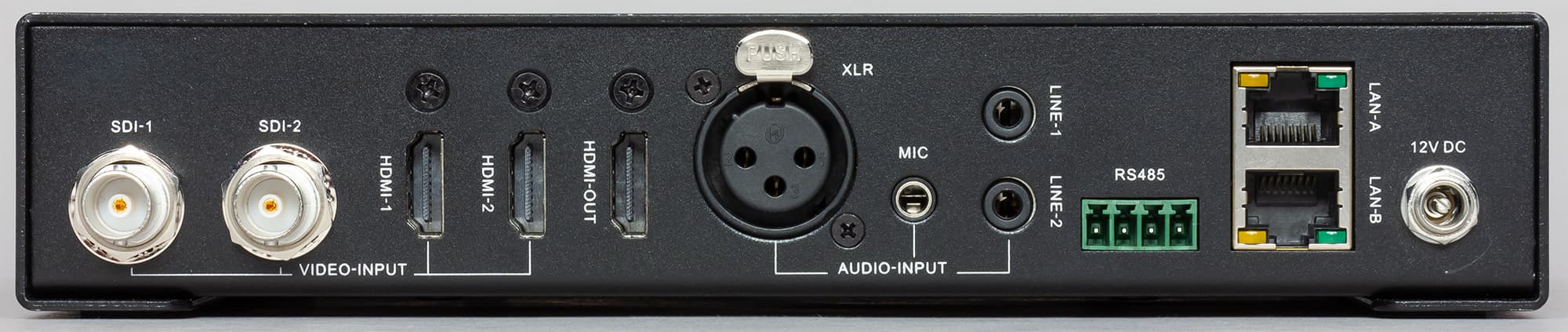 Задняя коммутационная панель содержит четыре цифровых видеовхода (два SDI и два HDMI), один HDMI-видеовыход, четыре аудиовхода (один XLR, один микрофонный и два аналоговых под трехконтактный миниджек 3,5 мм), коммуникационный разъем RS485 для внешнего управления, два основных разъема LAN Ethernet и вход адаптера питания.