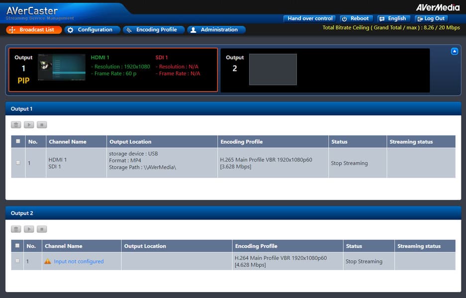 Главная страница веб-сервера устройства открывается на вкладке Broadcast list, которая содержит список текущих выполняемых или приостановленных заданий (трансляций или записей). В верхней части страницы можно видеть два блока Output, первый и второй. Здесь вживую отображается картинка, которая в данный момент поступает на видеокодер и выводится с него по сети. Рядом с миниатюрой присутствует информация о характере сигнала. На следующем скриншоте виден сигнал, поступающий на вход HDMI-1 (это работает подключенный видеоплеер), а красным цветом отмечено отсутствие второго сигнала, который должен приходить по SDI и может быть скомпонован с основным HDMI сигналом. Второй поток при этом отключен, об этом говорит пустое окошко просмотра и отсутствие информации о потоках.