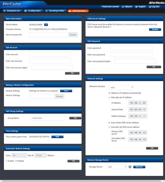 Наконец, последняя вкладка главной страницы — Administration. Из ее названия понятно, что здесь собраны системные настройки и элементы управления аппаратом: обновление прошивки, подключение к системе управления содержимым (CMS), сохранение и восстановление конфигурации и сетевые настройки, разные для каждого из двух сетевых адаптеров.