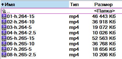Осталось лишь произвести вручную запись в восемь созданных пресетов, а длительность каждой записи пусть составит полминуты. Полученные восемь видеофайлов не отличаются длительностью и содержат одну и ту же, в основном статичную, сцену, зато различия в объеме — очень значительны.