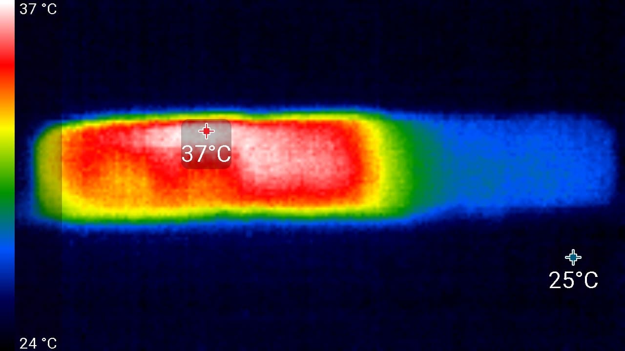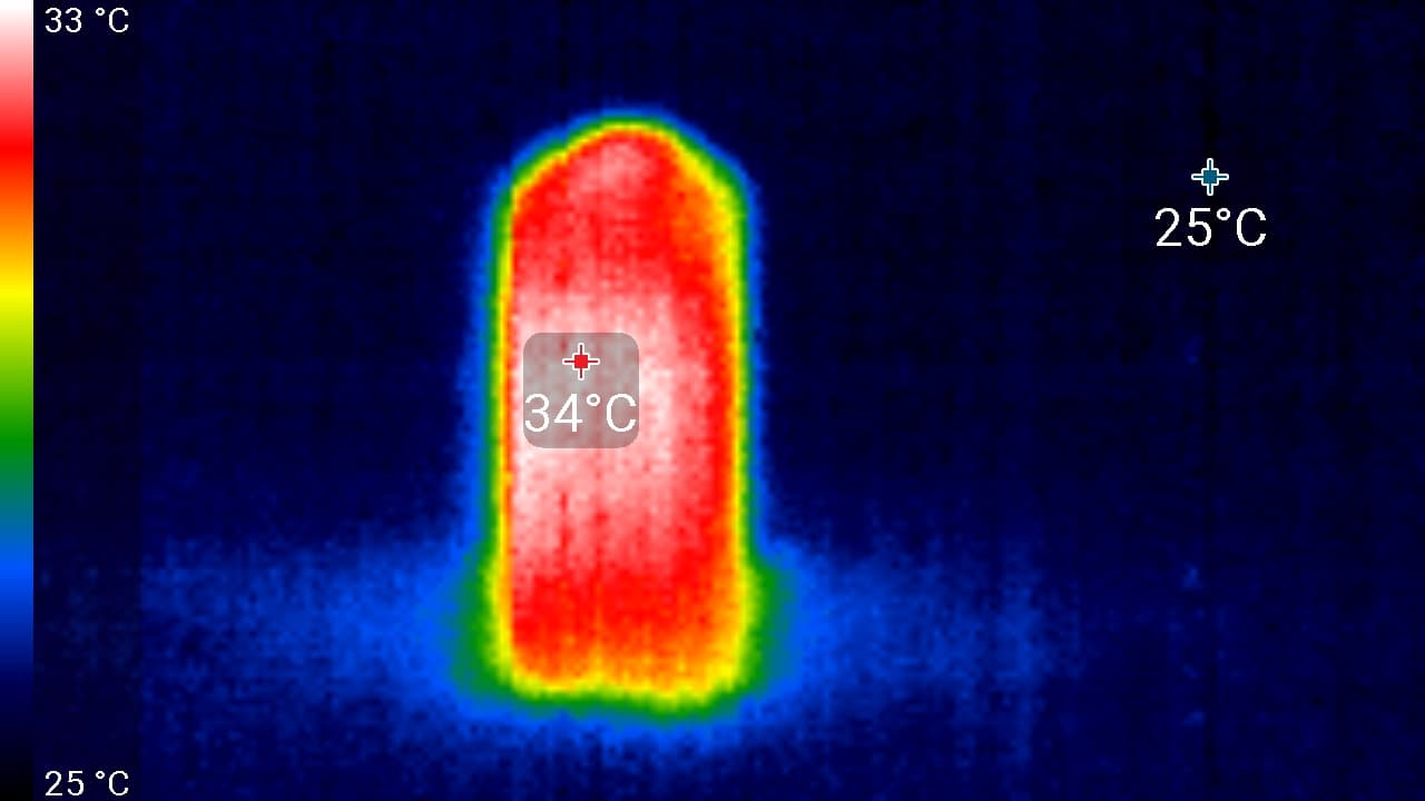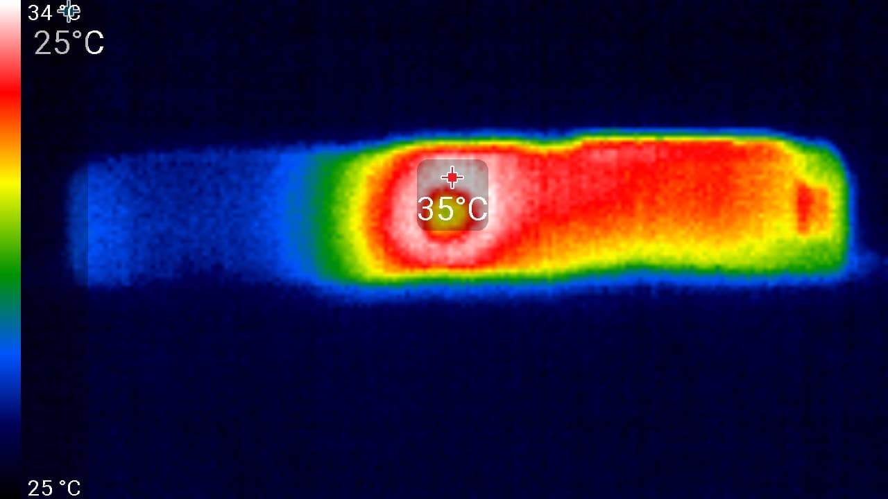 Изучению степени нагрева аппарата при длительной работе мешает автовыключение камеры, которое невозможно деактивировать. Камера автоматически прекращает запись в любом случае, можно лишь выбрать один из трех вариантов максимальной продолжительности: 3, 5 или 10 минут. А такой опции, как «Не отключать», разработчики не предусмотрели. Тем не менее, мы все же довели камеру до максимального нагрева, выбрав 10-минутный интервал и четырежды принудительно включая запись сразу по окончании 10-минутного отрезка. Во время записи очередной 10-минутки камера была сфотографирована тепловизором. Температура помещения, где производилась работа, составляла 25 °C.