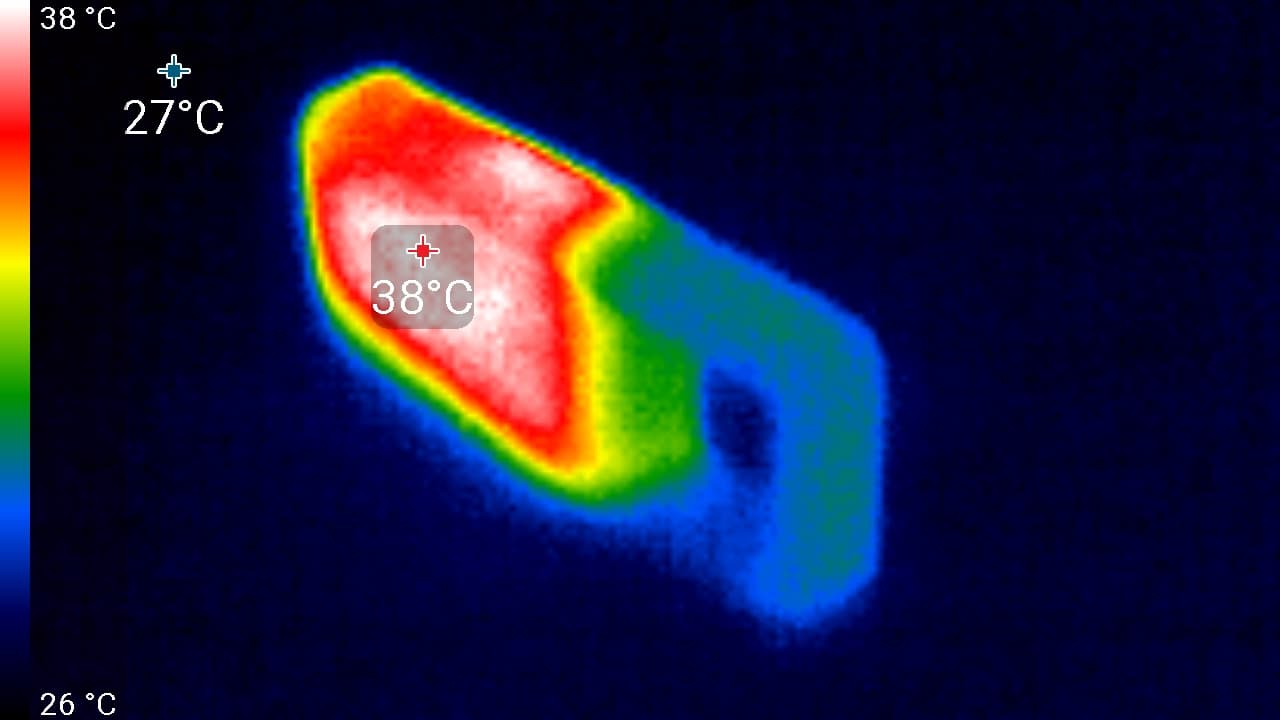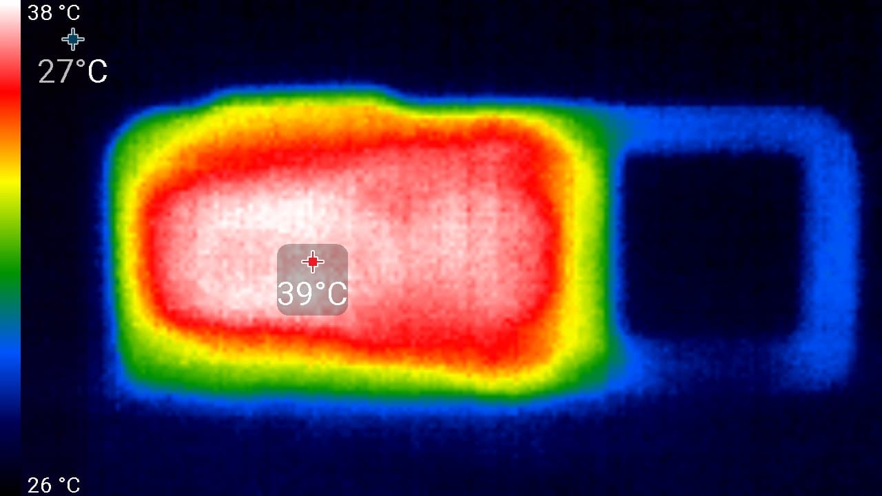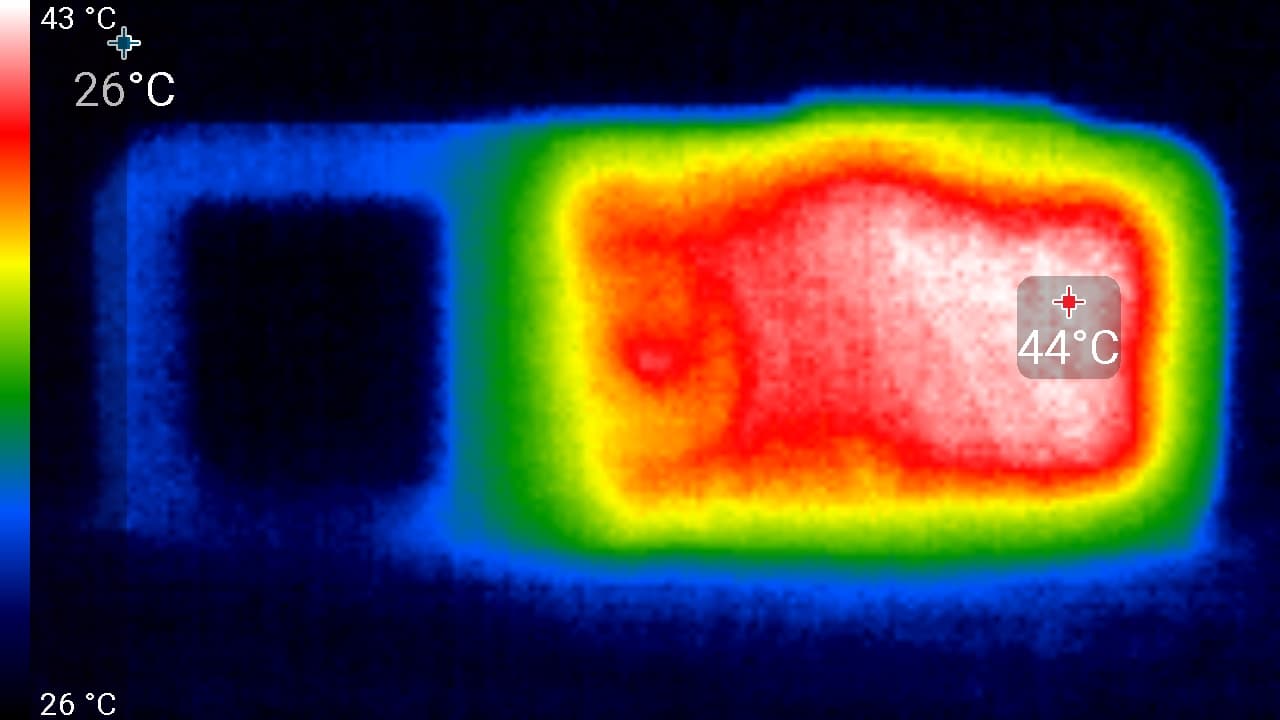 Максимальная температура корпуса (44 °C) наблюдается только на одном участке, в правой части задней панели. По всей видимости, здесь расположен процессор, обрабатывающий видеопоток и отвечающий за прочие операции, производимые камерой. Такая температура не опасна для современной электроники, хотя в руководстве пользователя имеется предупреждение о возможном перегреве устройства.