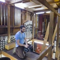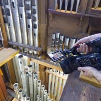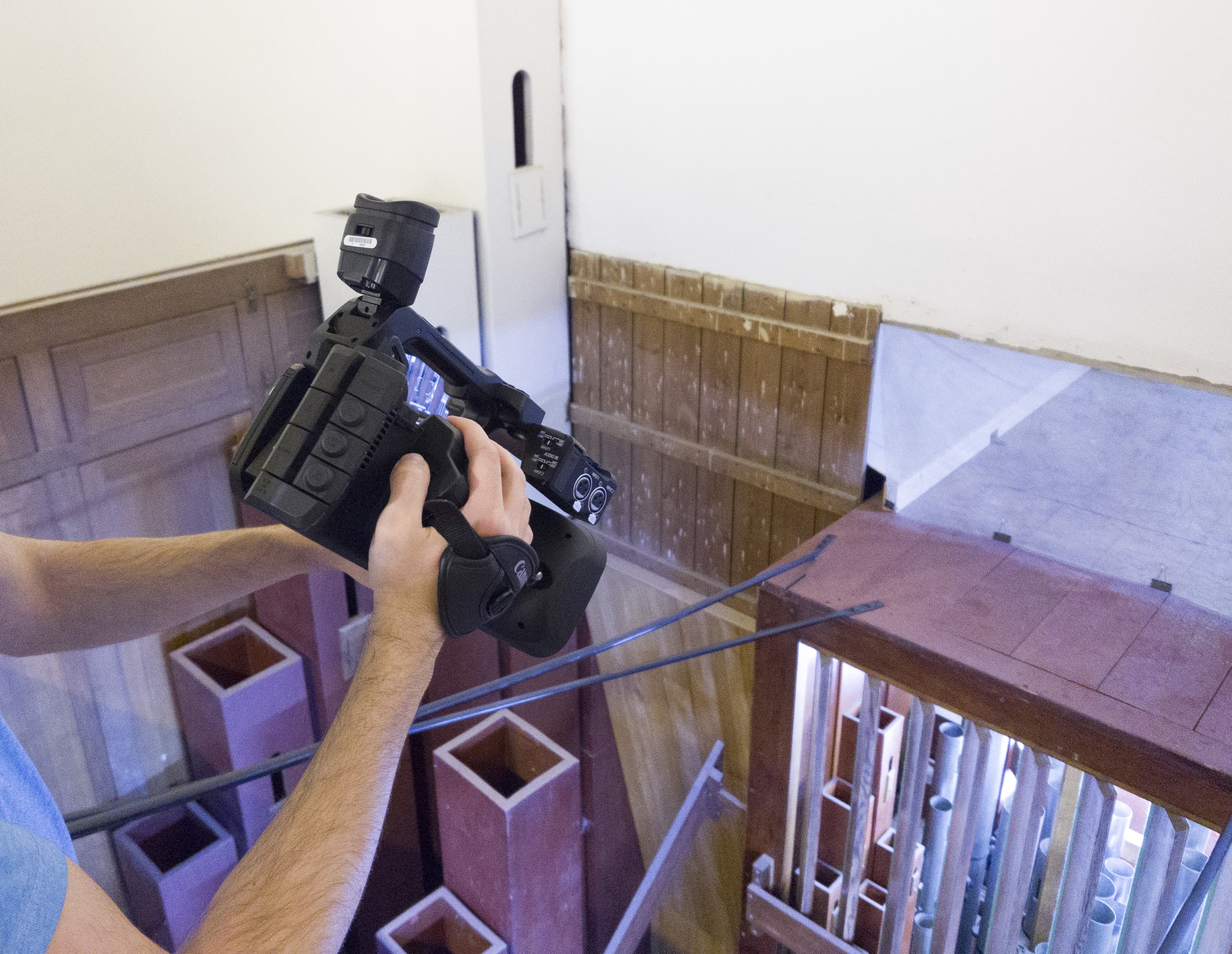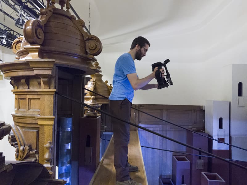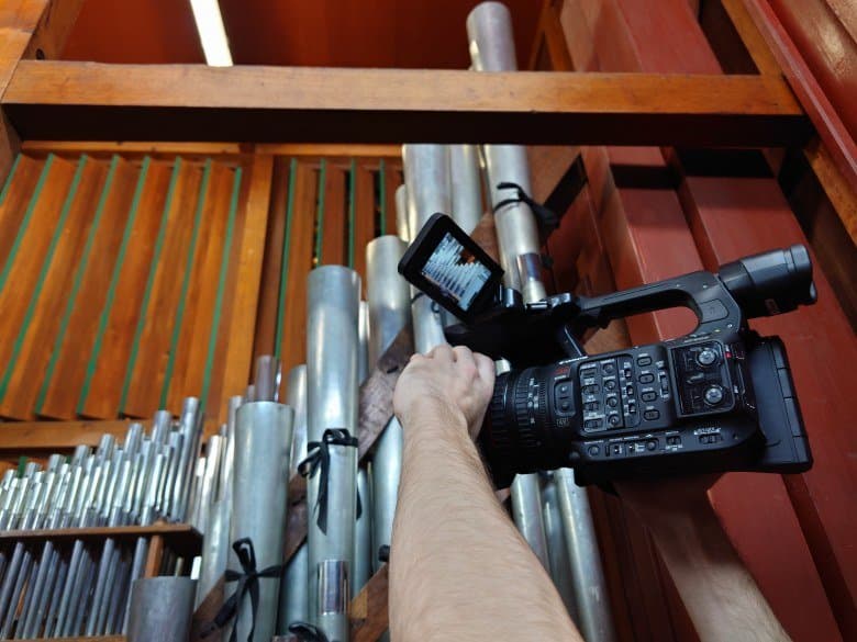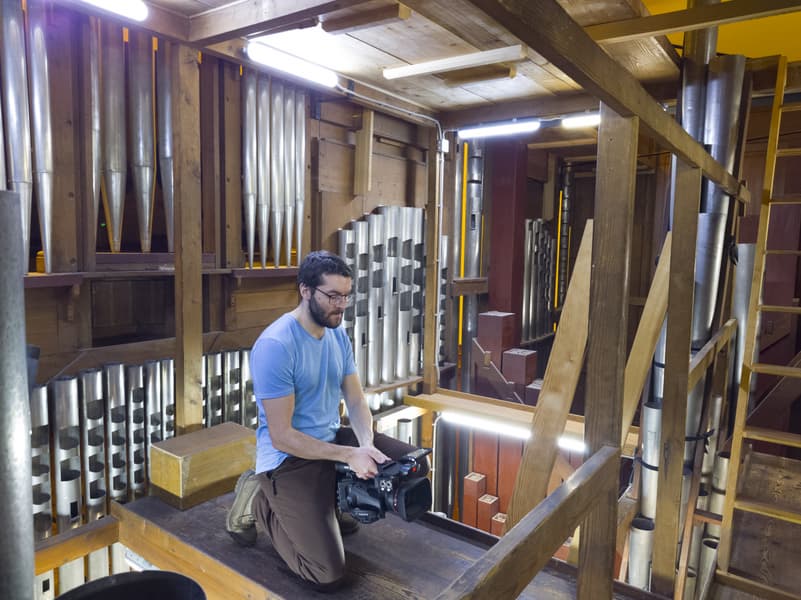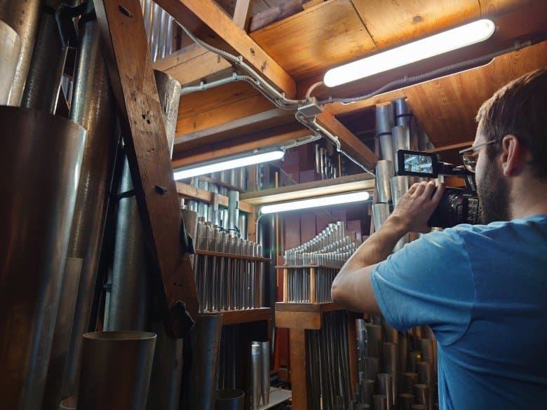 Как уже неоднократно упоминалось, орга́ну Большого зала консерватории более ста лет. Ме́ста для оператора внутри орга́на очень мало, не говоря уже о съемочном оборудовании. Даже стедикам, который мы использовали в нескольких сценах при съемке фильма «Симфония орга́на», далеко не везде спасает ситуацию, особенно на вертикальных лестницах и узких мостках. Стоит ли говорить, что ме́ста для отдельного фотографа с камерой здесь нет совсем. Поэтому в качестве фотографа выступил режиссер ролика Сергей Уваров, а в качестве камеры — смартфон Sony Xperia Pro-I.