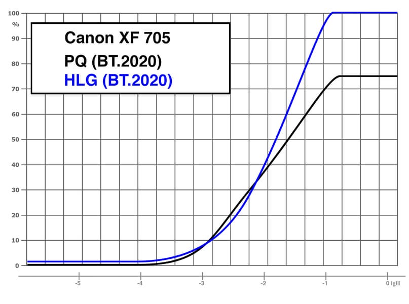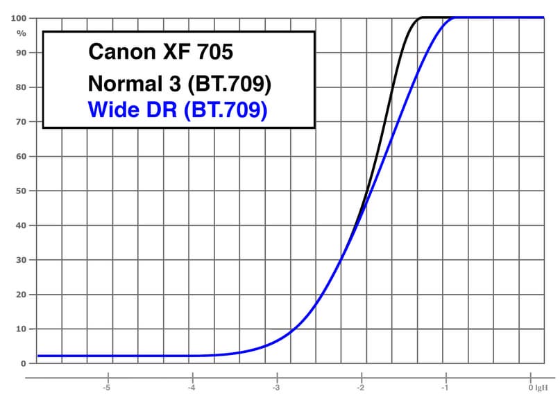 «Canon Log 3»: гамма Canon Log 3 / цветовое пространство BT.709/BT.2020. При съемке в Canon Log 3 используется весь динамический диапазон камеры, который, по измерениям, составил 12 ступеней экспозиции. Применение этой гамма-кривой подразумевает последующую постобработку снятого материала. В камере Canon XF705 при съемке в логарифмической гамме есть возможность применять коррекцию LUT к изображению, выводимому на монитор или разъемы SDI/HDMI.