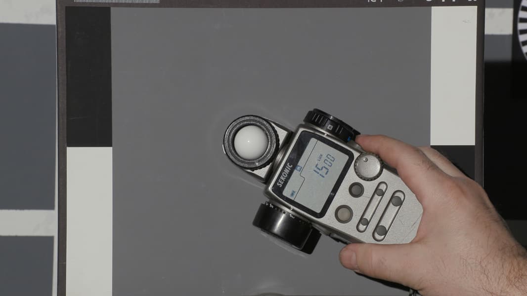 Тестовый кадр, снятый с гаммой Wide DR на диафрагме F8 с выдержкой 1/50 с и усилением 3 дБ, потребовал уровня освещенности в 1500 люкс. Это соответствует значению индекса экспозиции ISO 500. Увеличение или уменьшение усиления на 6 дБ равноценно изменению значения чувствительности на одну ступень.