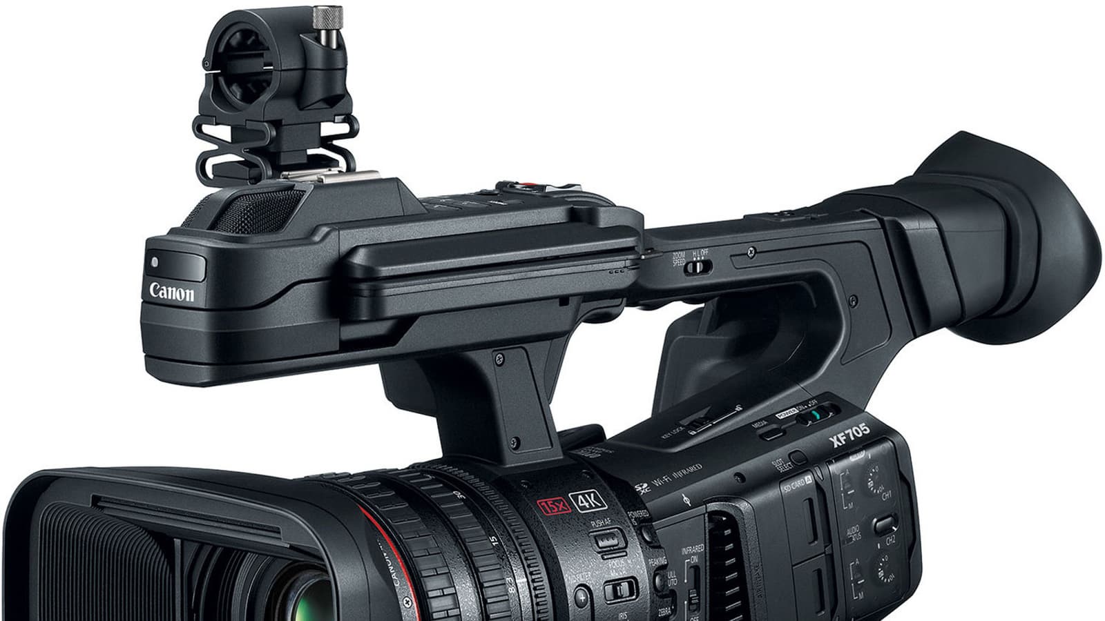 Осенью прошлого года линейка профессиональных видеокамер Canon пополнилась флагманской моделью — XF705. Это первая профессиональная камера Canon, имеющая возможность съемки в ставшей в последнее время актуальной гамме HDR. При использовании нового кодека XF-HEVC стала возможна запись на SD-карту файлов 4К (UHD) 10 бит с семплированием цвета 4:2:2. Камера имеет моноблочную компоновку, с традиционным для профессиональных видеокамер расположением органов управления.