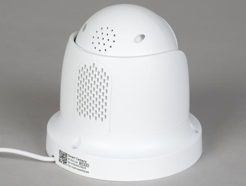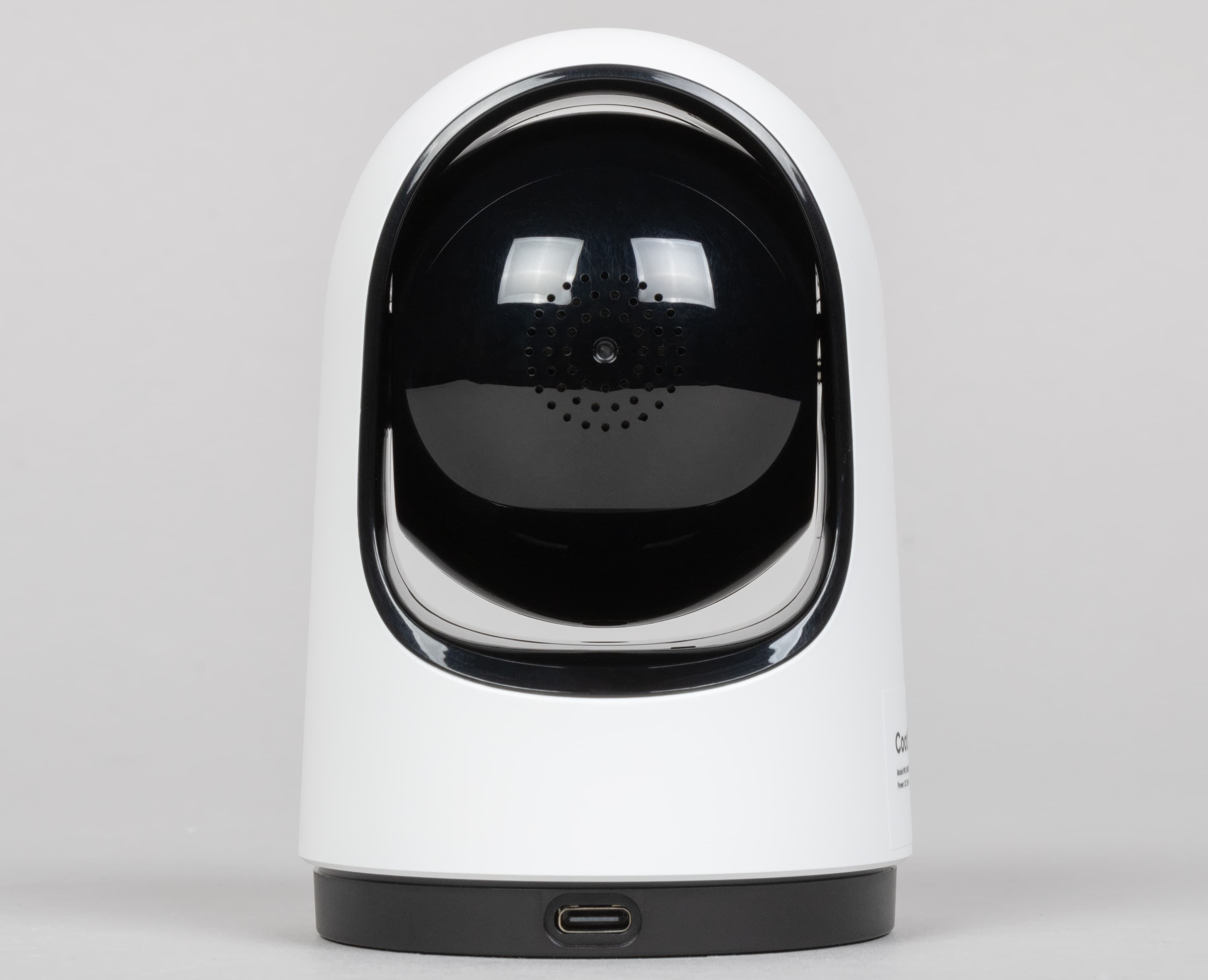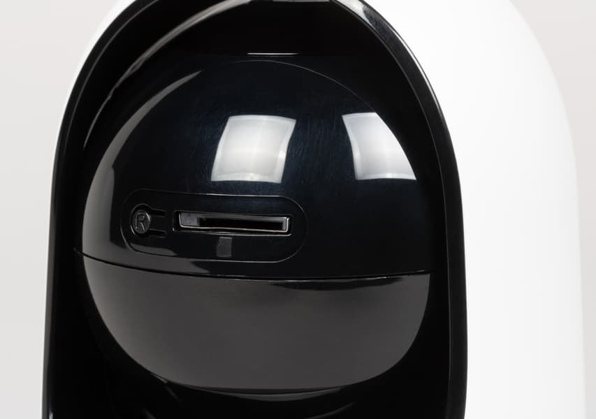 Конструкция камер сильно различается. И правильно, ведь назначение их разное. Комнатное устройство состоит из трех узлов: неподвижная площадка черного цвета, поворотный блок в виде арки, и находящийся внутри нее черный глянцевый качающийся шарик, в котором находится оптико-электронный блок. Уличная камера также состоит из трех частей — неподвижная площадка-опора, поворотный блок и шарообразный оптический блок. Однако, в отличие от комнатной версии, этот шарик качаться не умеет, наклон здесь выставляется вручную.