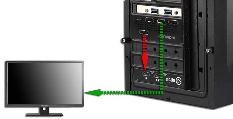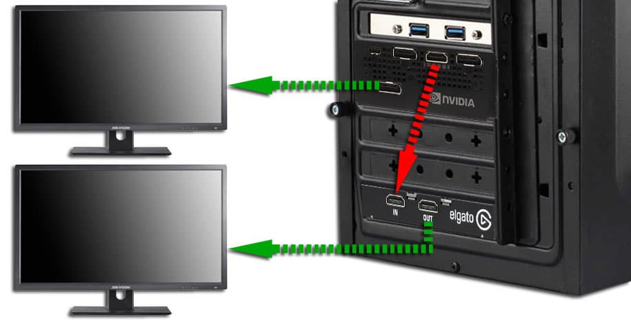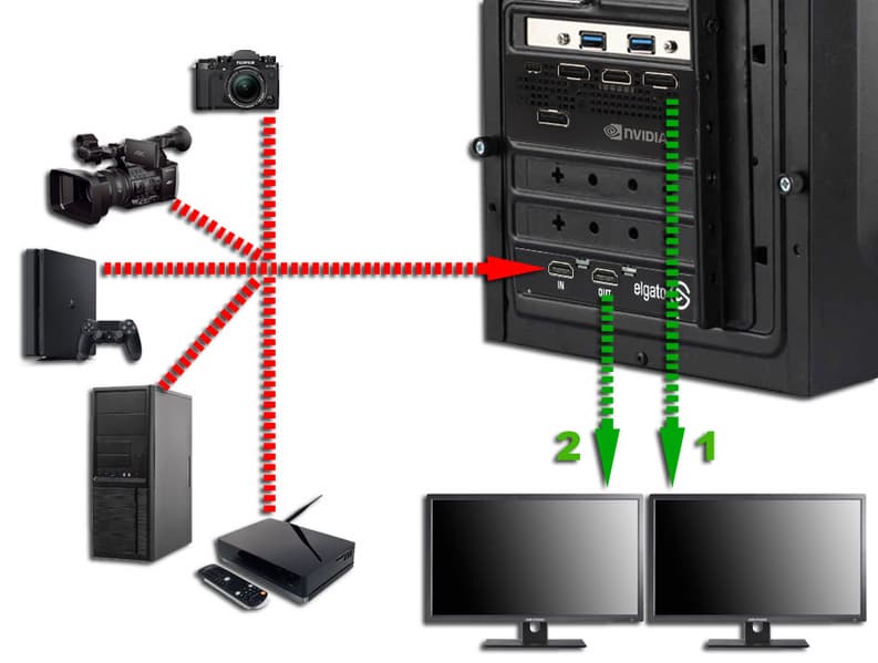 С мониторами ситуация чуть сложнее, она зависит от необходимости видеть прямой сигнал, идущий из источника. Если такая необходимость имеется — монитор можно подключить к выходу устройства захвата (зеленая стрелка 2), но при этом на мониторе (или телевизоре) будет присутствовать только этот сигнал, никаких компьютерных интерфейсов там не увидишь. Основной же монитор (или несколько) обязательно подключаются ко входу видеокарты по понятным причинам (зеленая стрелка 1).