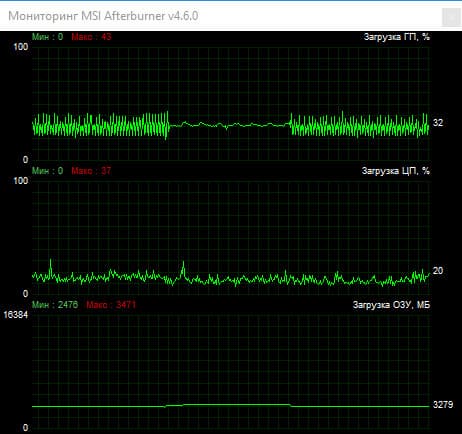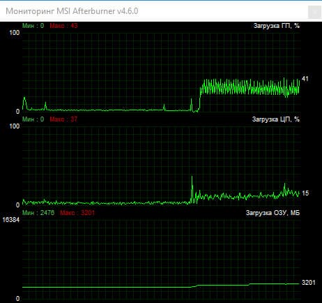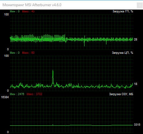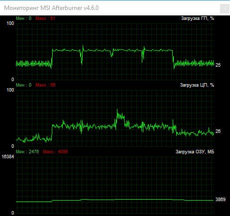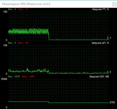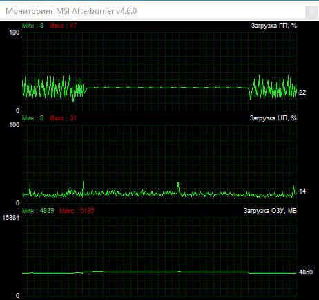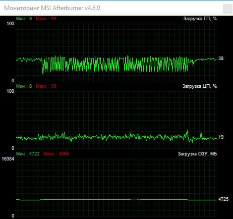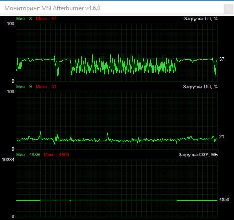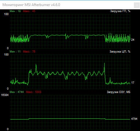 В отличие от более-менее ровного графика GPU, график загрузки центрального процессора во время записи 4K HDR выглядит взбалмошным. Наверное, потому что ЦП, помимо текущей задачи, выполняет в фоне еще десятки или сотни других задач. Видимо, в этот момент (пик в центре) один из модулей связался с каким-то удаленным ресурсом, это бывает.