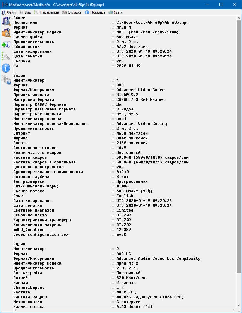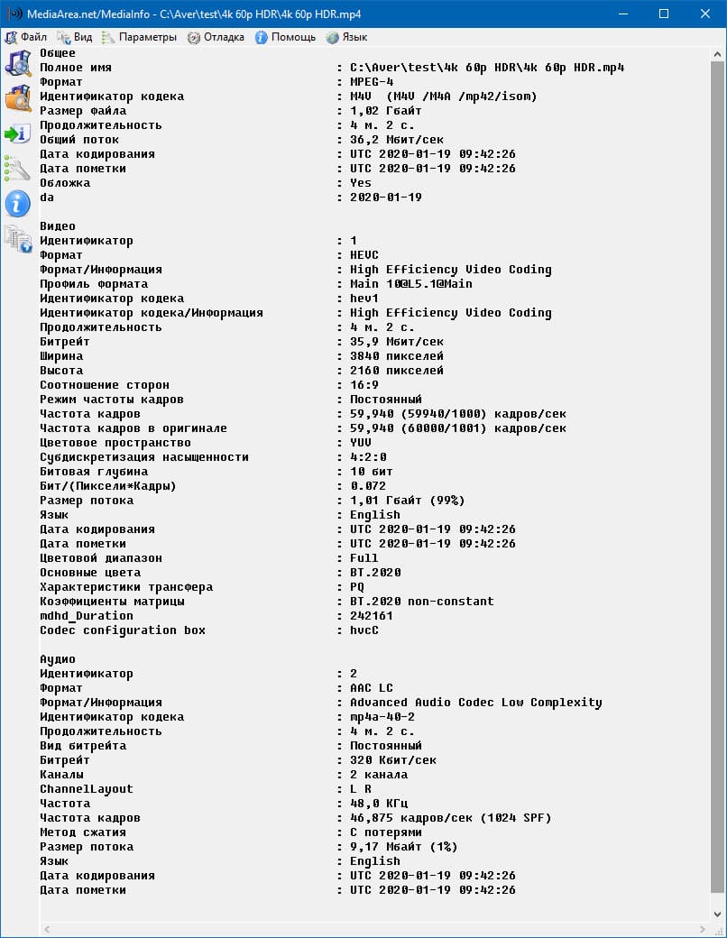 Один примечательный момент: программное обеспечение карты захвата не дает возможности выбрать кодек, с которым будет сохраняться захватываемое видео. По умолчанию любое видео кодируется в AVC (H.264), даже 4K с высокой частотой кадров. Но лишь до тех пор, пока на вход не поступит сигнал 4K HDR. Карта, зафиксировав такой сигнал, станет использовать кодек HEVC (H.265), поскольку только он позволяет сохранить 10-битное видео. Ниже приводятся скриншоты характеристик видеофайлов, записанных в форматах 4K 60p и 4K 60p HDR.